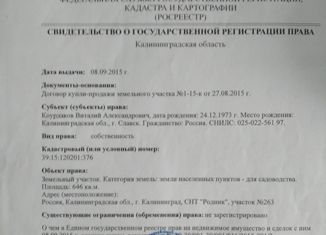 срочно продам земельный участок в СНТ победа ( конец улицы Горького)39:15:130402:970расположен в 200 метрах от автобусной остановки и магазинов. |