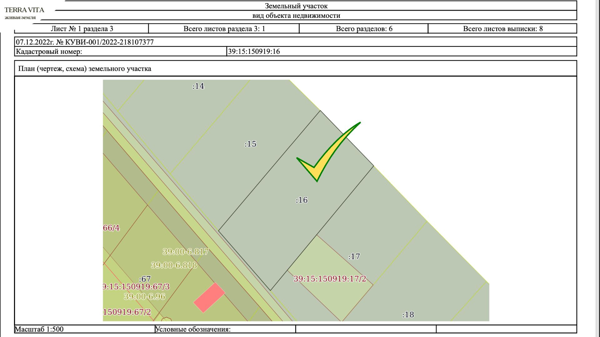 • Участок с кадастровым номером 39:15:150919:16 площадью 690 м2 по адресу ул. А. Суворова, СТ Космос, ул. 1-я линия, 31