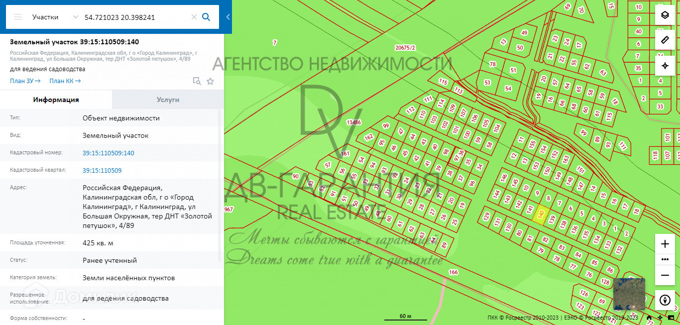 Категория земель: земли населённых пунктов — для ведения садоводства (дача). Допустимо строительство объектов капитального строительства (в т.ч. жилых с возможностью регистрации). Ориентир: питьевое озеро Белое в конце проспекта Победы города Калининграда.