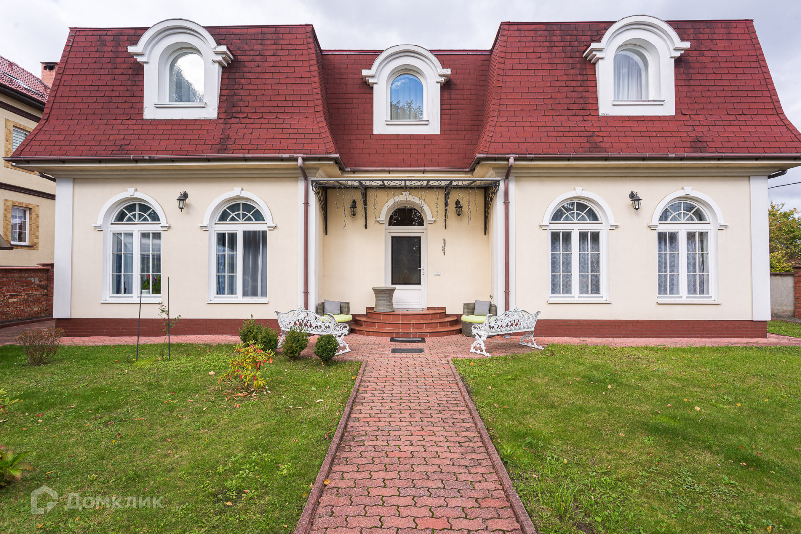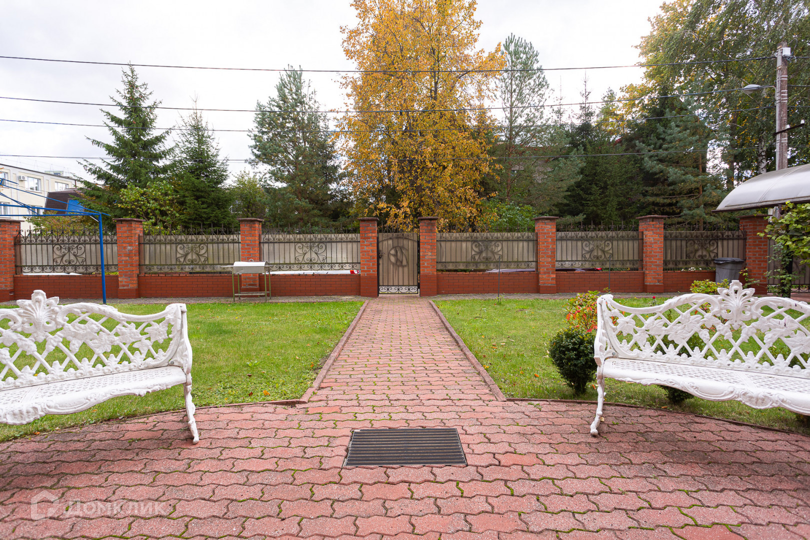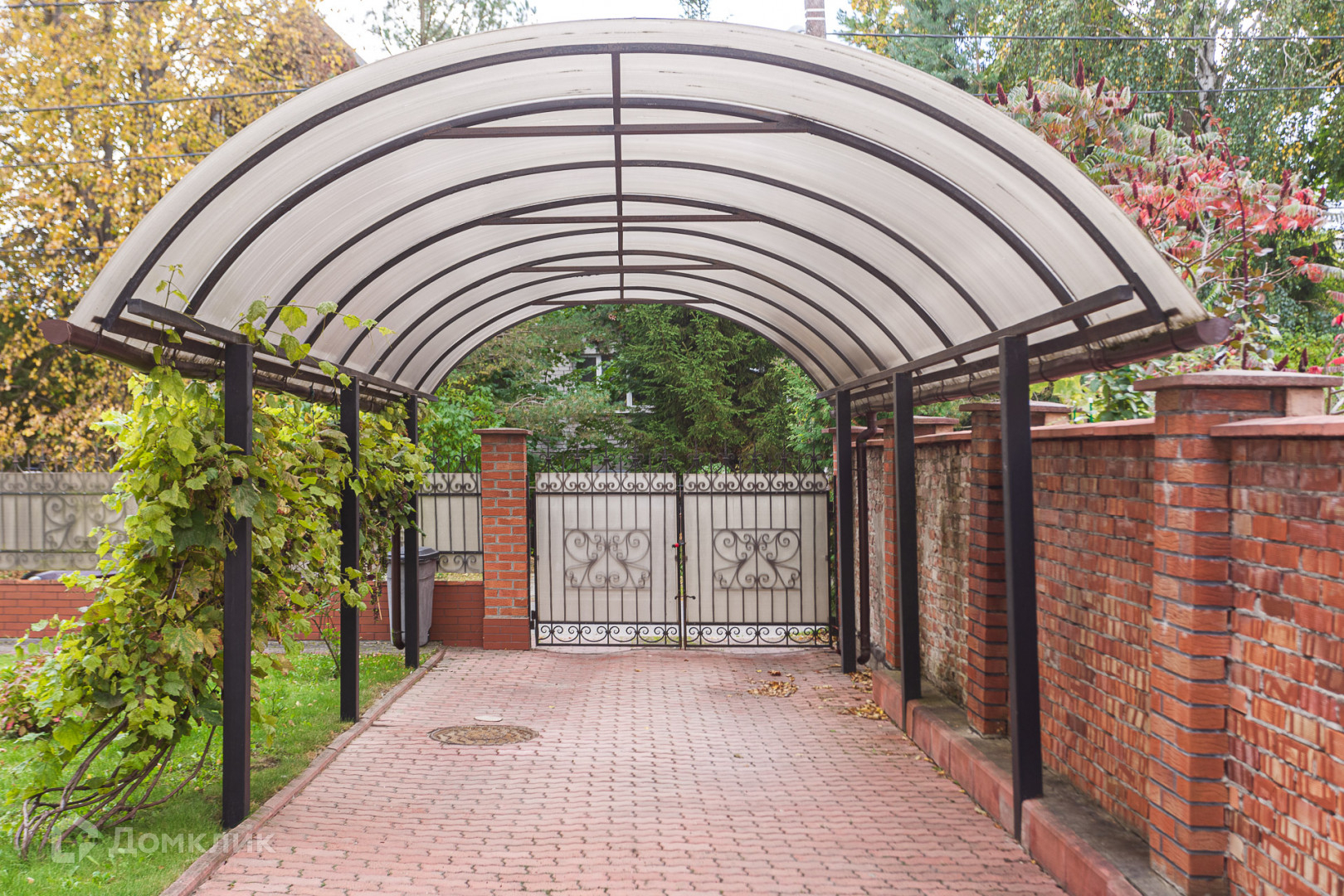 Благоустроенная территория, забор по периметру участка кирпичный. На территории есть гараж и парковочное место с навесом. Несмотря на небольшой участок, что скорее является преимуществом, так как не требует много усилий для поддержания его в порядке, там достаточно места для зоны отдыха и зоны барбекю.