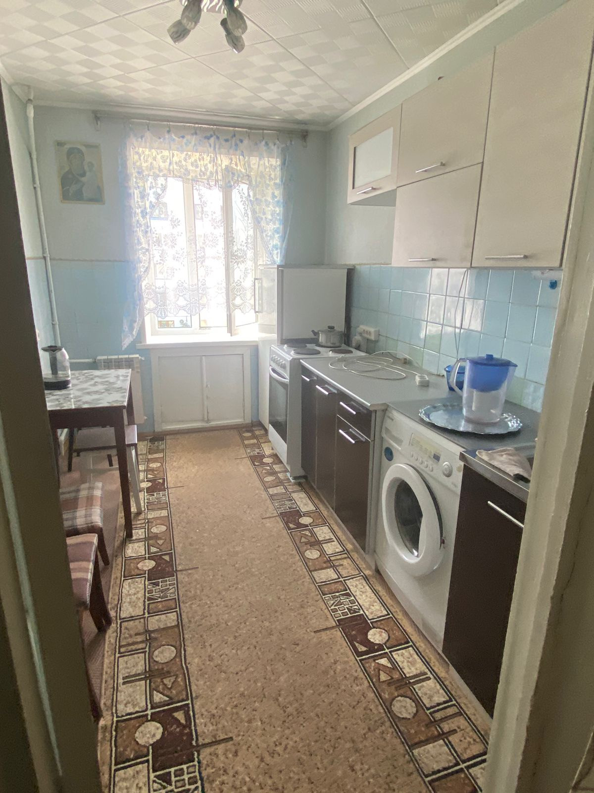 Продам светлую и очень теплую квартиру улучшенной планировки кирпичного дома . Дом расположен в тихом дворе . Окна выходят на обе стороны . Во дворе дома большая парковка . В шаговой доступности два парка для прогулок , кинотеатр, а также вся инфраструктура.  В квартире остается вся мебель и все , что вы видите на фото . В туалете выложена плитка, на ванную тоже куплена. Можно заходить и жить .  Торг уместен . Один взрослый собственник.