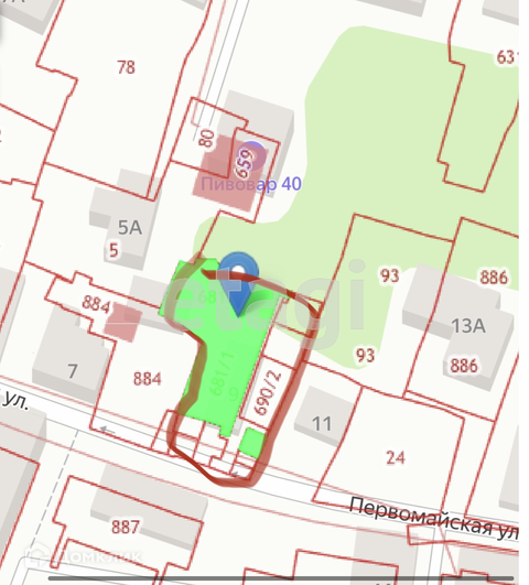 Продается участок по улице Первомайской.1 сотка. Это часть участка общей площадью 10 сот. Есть возможность продать весь участок. На участок заведены газ и электричество, вода проходит по границе участка.
