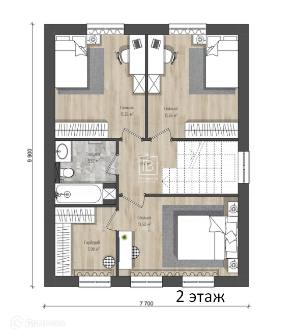 На первом этаже предусмотрен просторный холл площадью 20 квадратных метров, санузел, кабинет, который при желании можно использовать как комнату для гостей, и кухня-гостиная с выходом на задний двор. Из большого холла лестница ведет на второй этаж, где располагаются три спальни, гардеробная и второй санузел.
