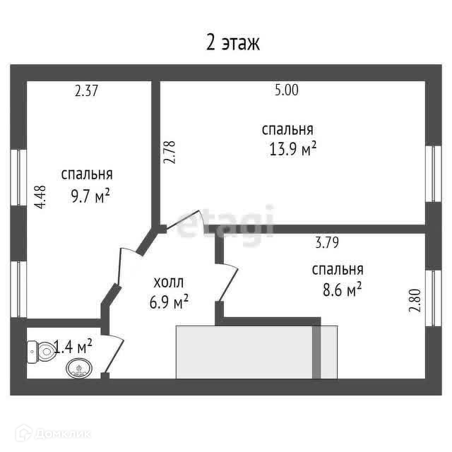 ● 2 этaж - 3 изолированные комнаты 13,9 / 8,6 / 9.7 м², туалет 1,4 м².