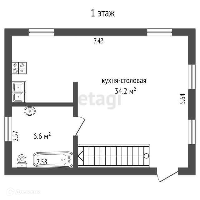 ● 1 этaж - кухня-столовая 34,2 м², просторный санузел 6,6 м².