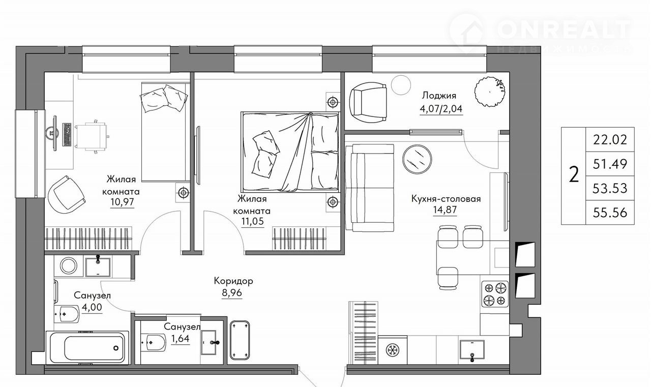 Общая площадь 55.6 м2
