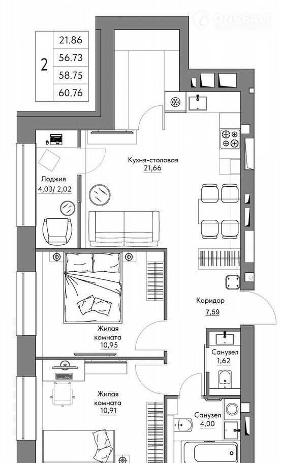 Общая площадь 60.8 м2