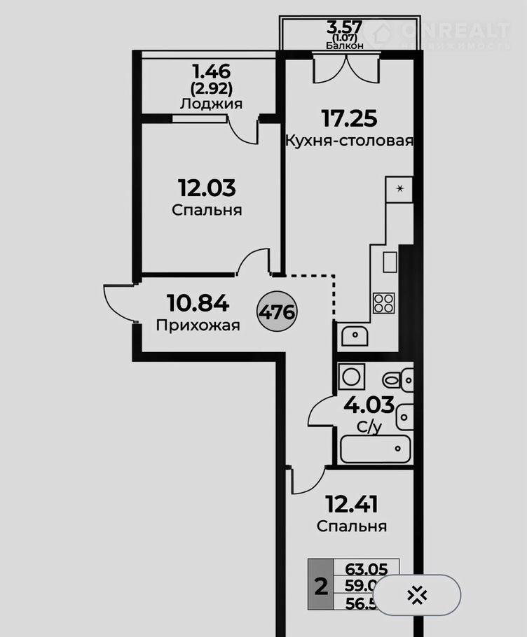 Общая площадь 59.1 м2