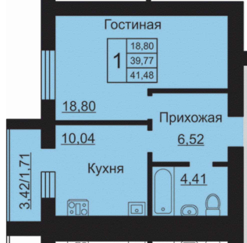 Общая площадь 41.5 м2
