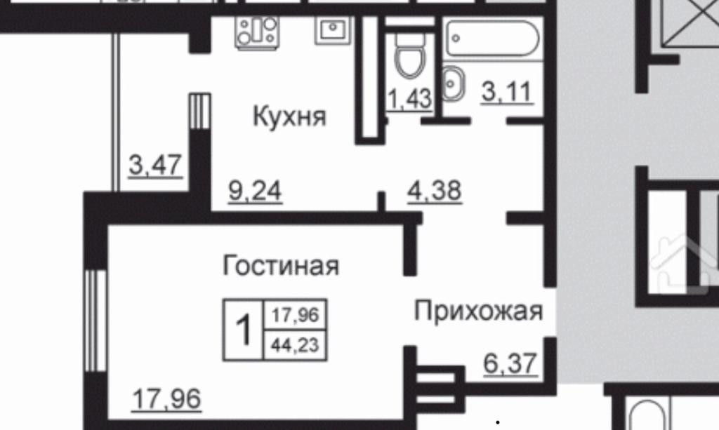 Общая площадь 44.23 м2