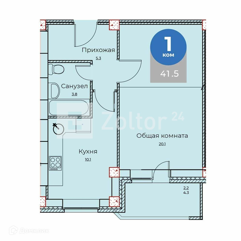 Общая площадь 41.5 м2