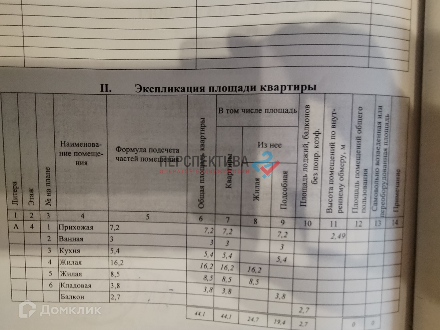 - Общая площадь 44.1 кв.м, жилая 24.7 кв.м, кухня 5.4 кв.м, кладовая 3.8 кв.м.