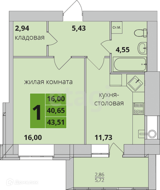 Общая площадь квартиры 43,51 кв.м.,предусмотрена большая кухня-столовая 11,73 кв.м.,площадь жилой комнаты 16 кв.м. Обратите внимание на очень удобную планировку , в отдельное помещение выведена кладовая, большая прихожая, и лоджия.