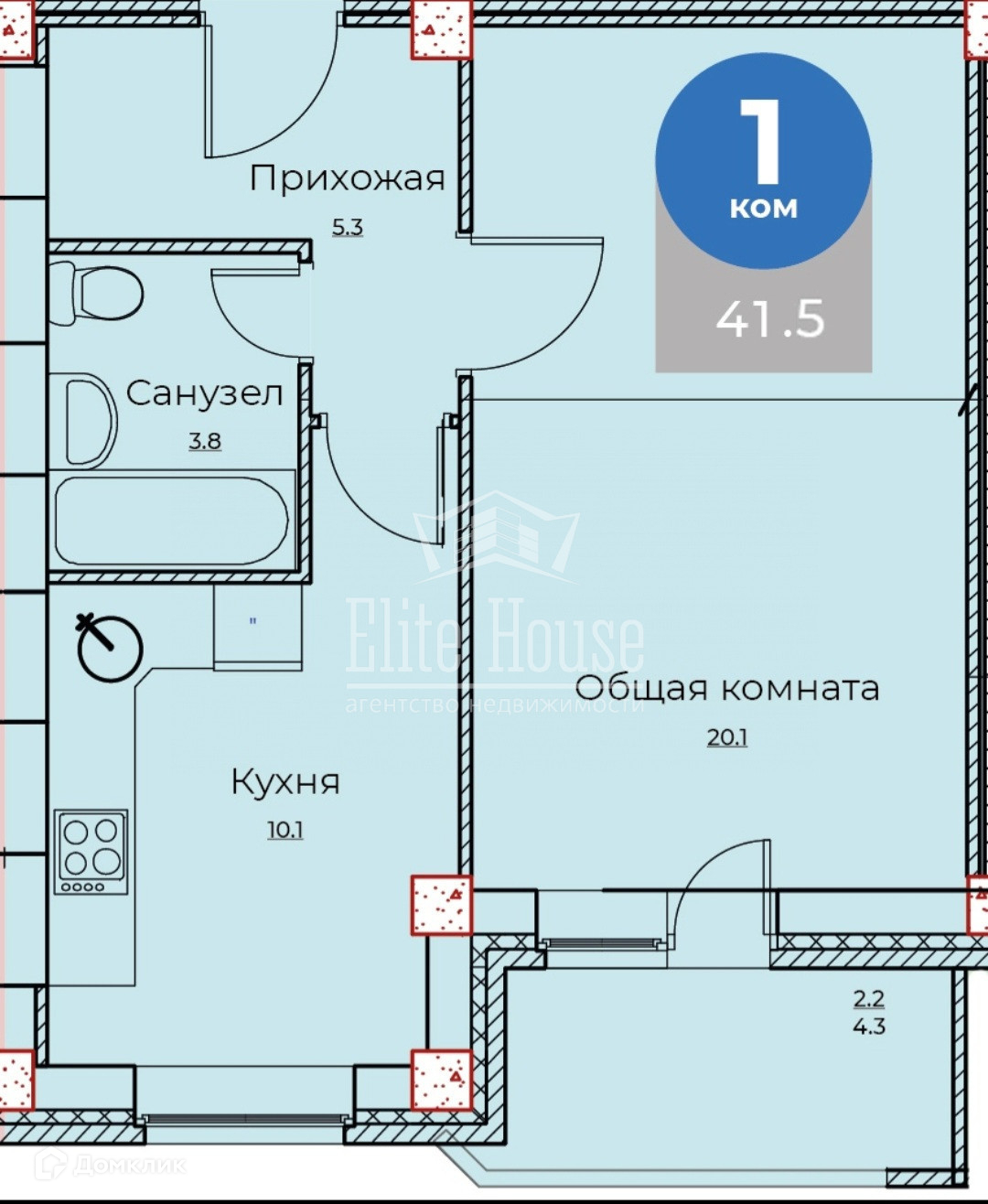 Общая площадь  41,5 м.кв