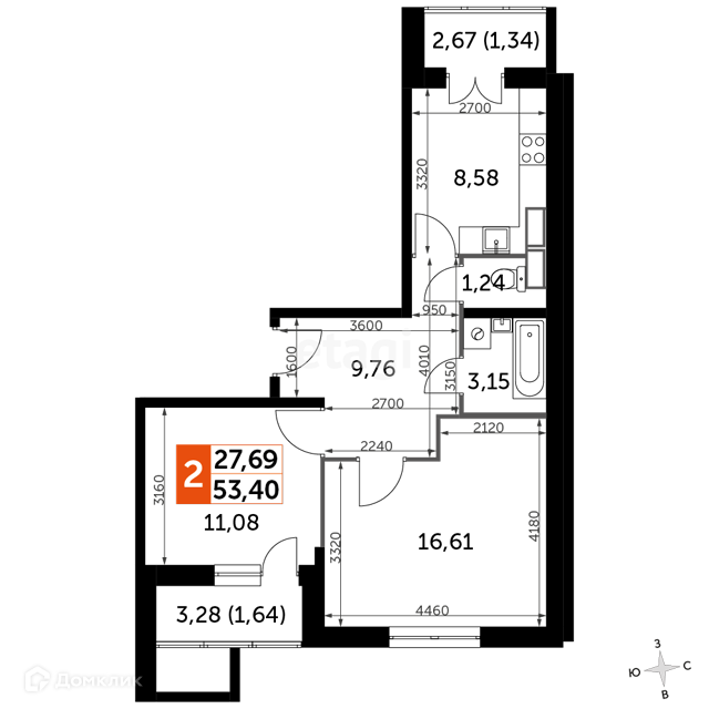 Общая площадь 53.4 м2