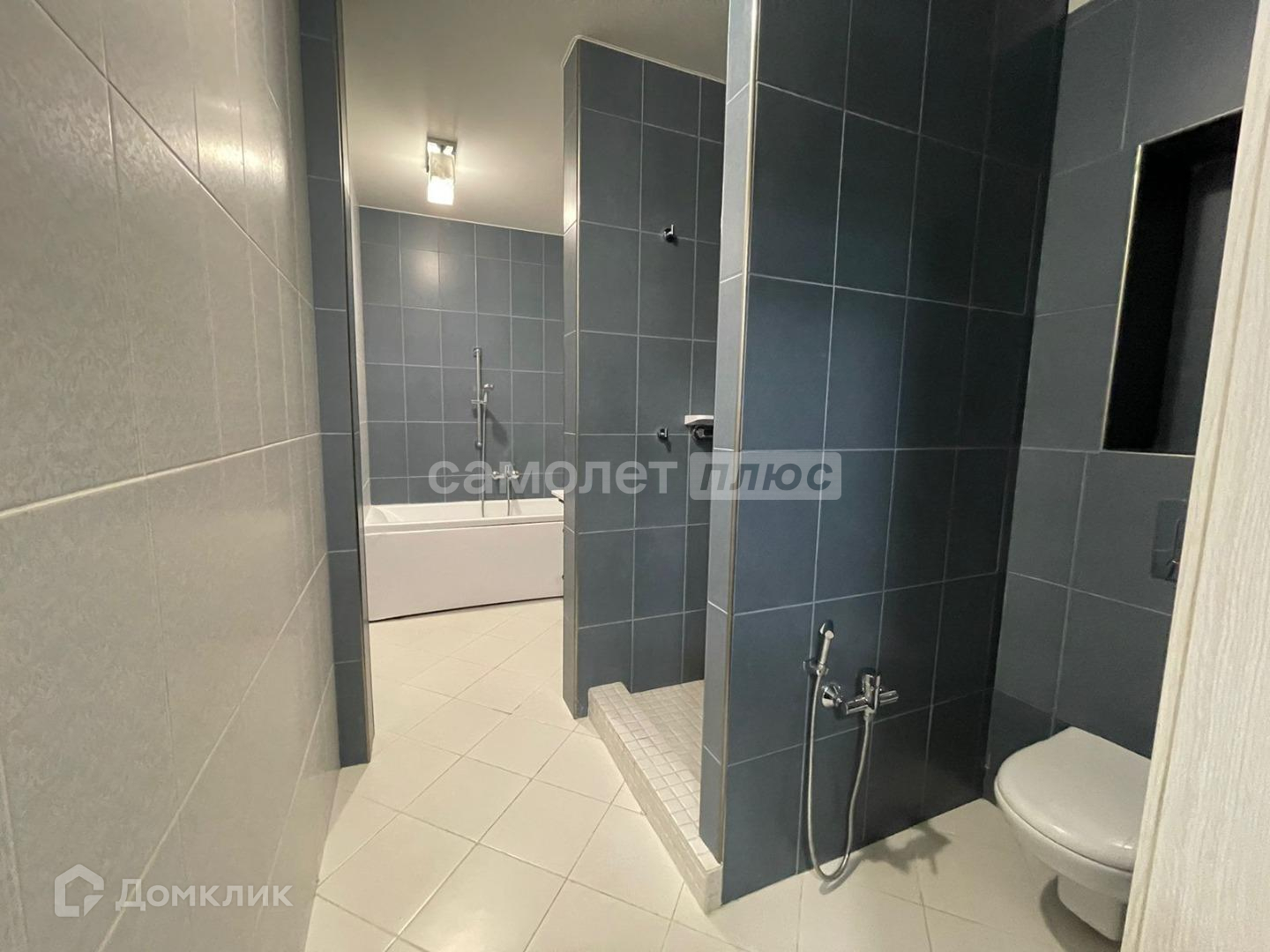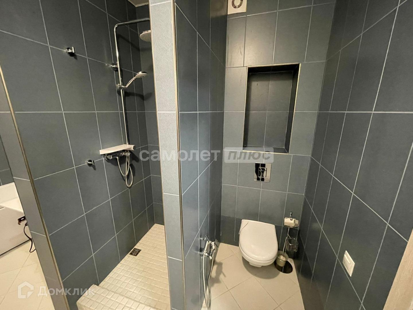 Санузел совмещенный в качественной плитке, с ванной и душевой кабиной.