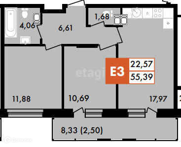 Общая площадь 55.4 м2