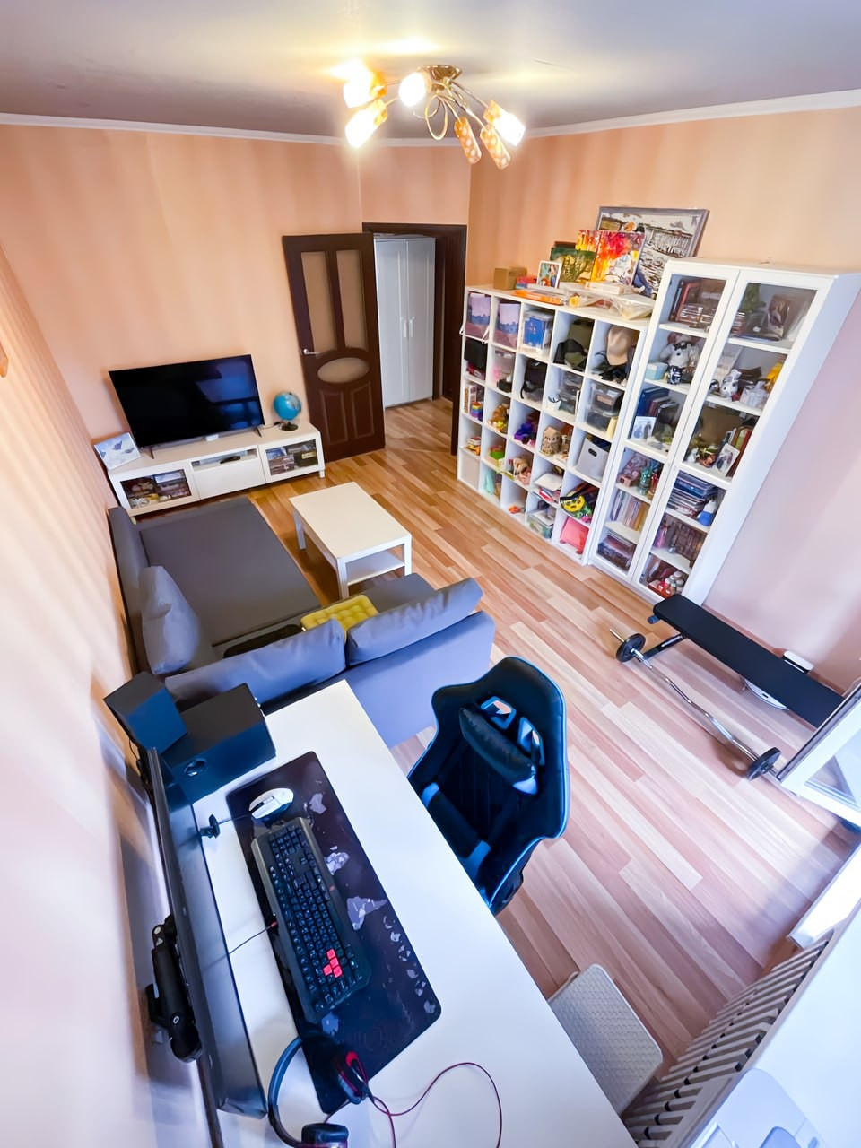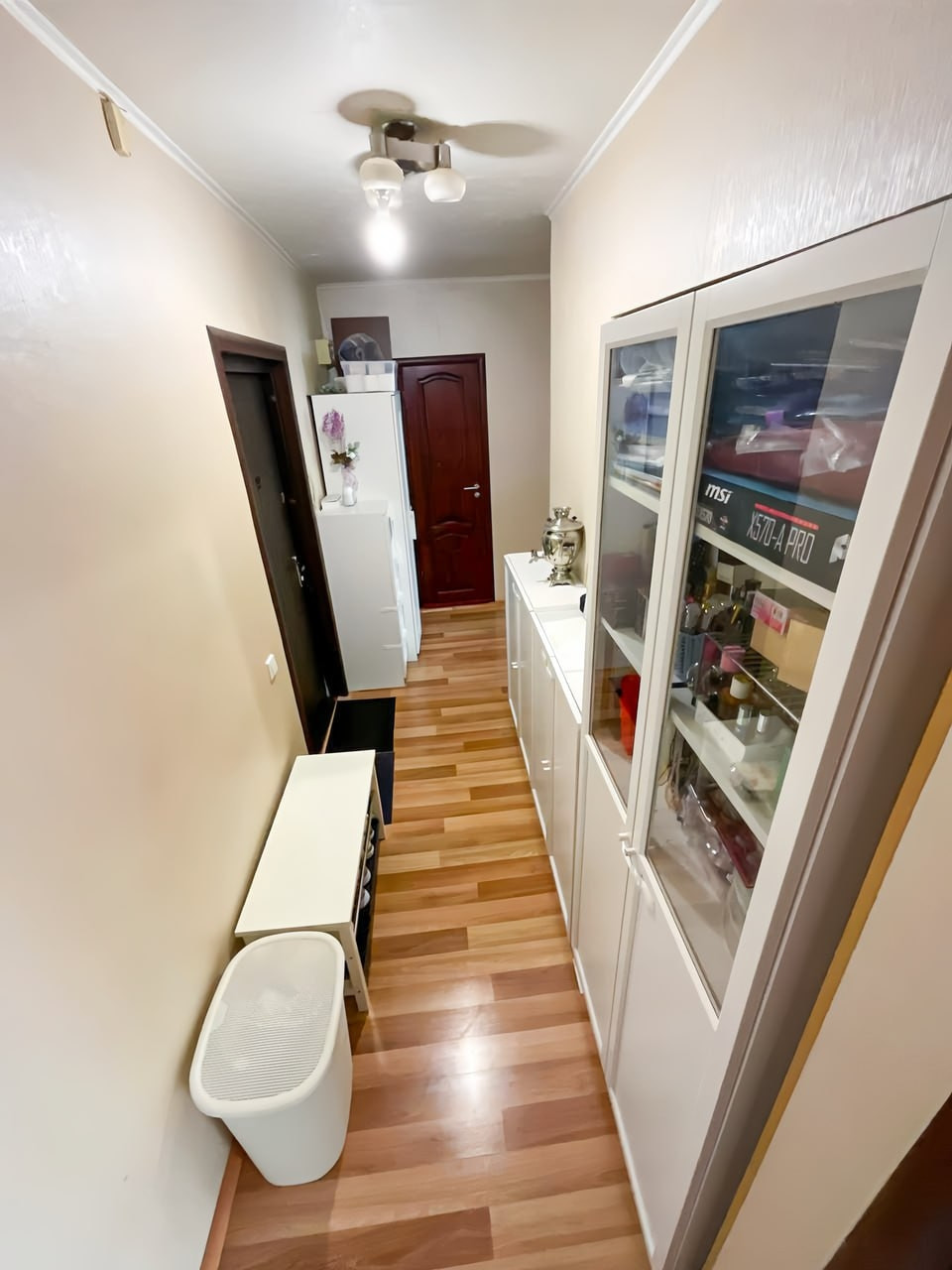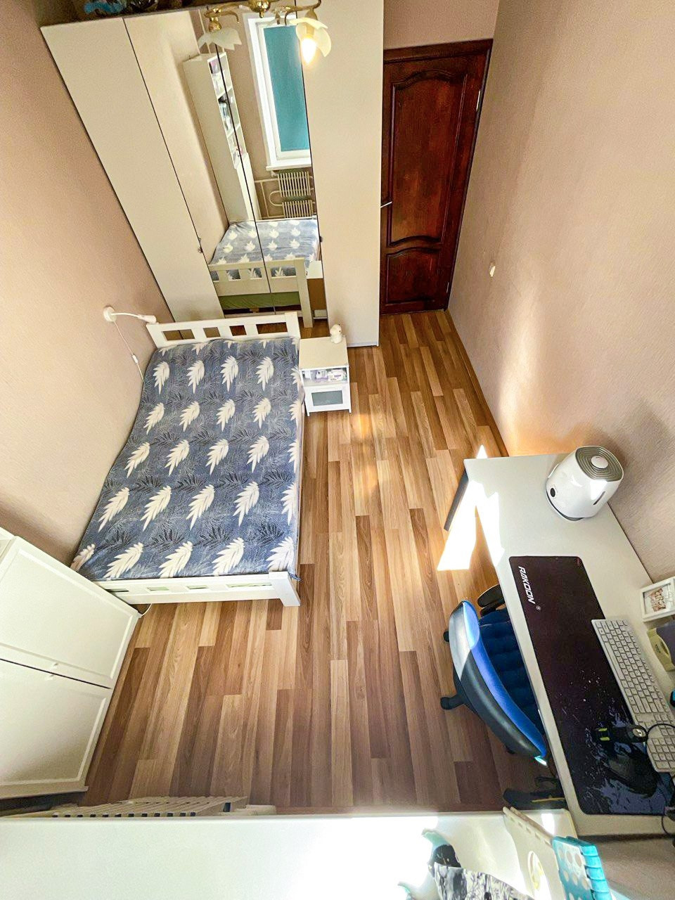 Стены ровные, частично заменена проводка. Кухня остаётся. Окна пластиковые. Лоджия застеклена.
