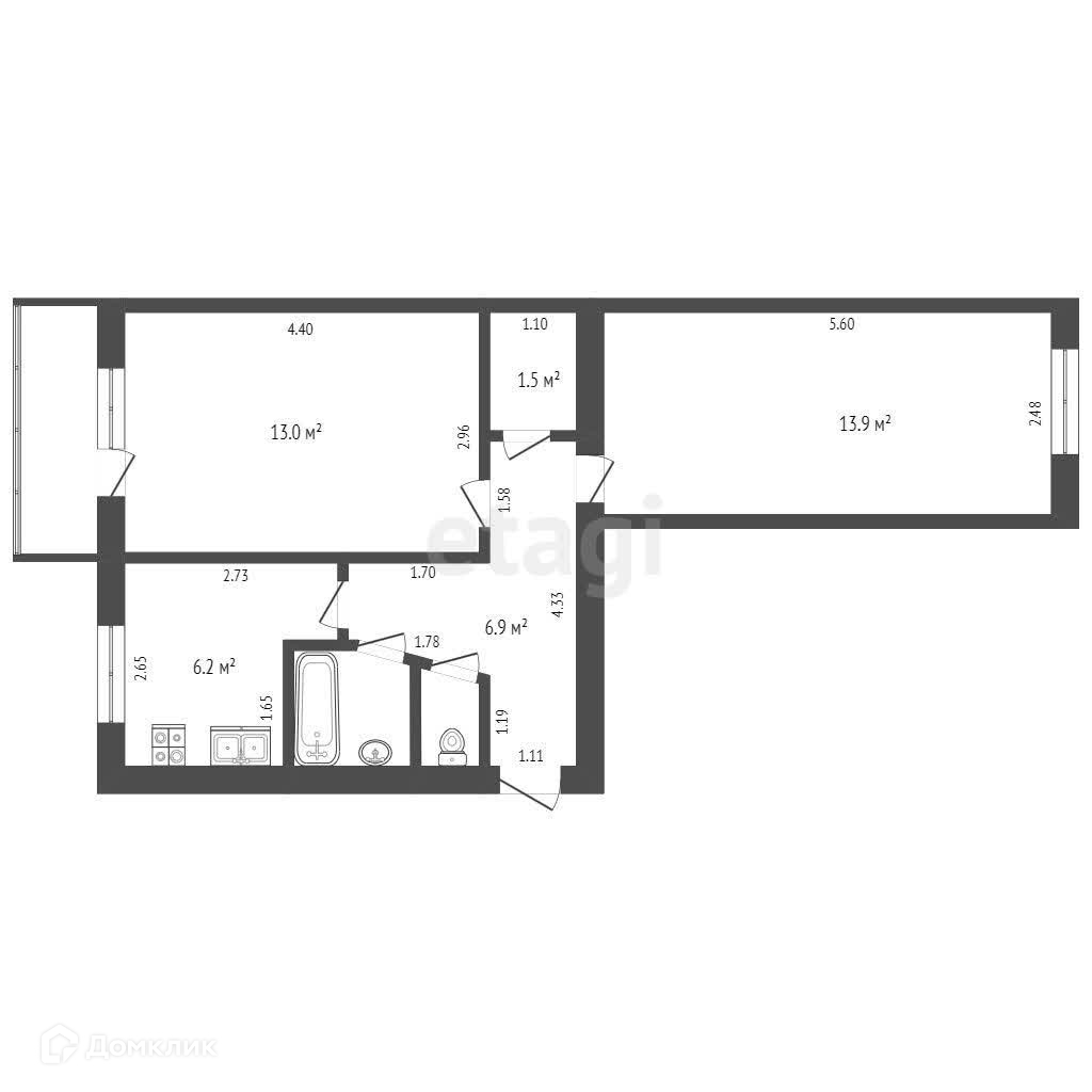 Общая площадь 44,9 кв.м. , кухня 6,2 кв.м.