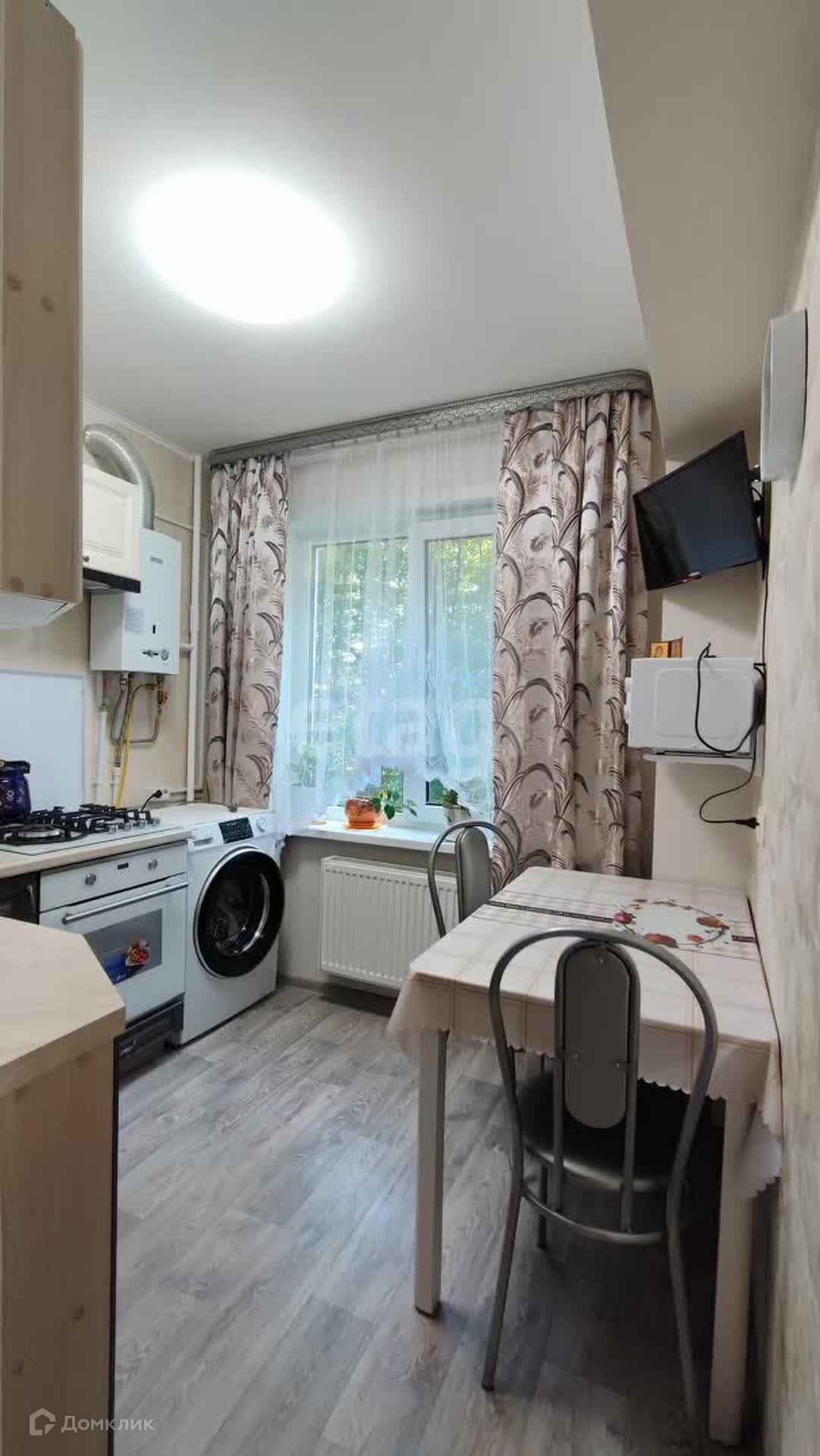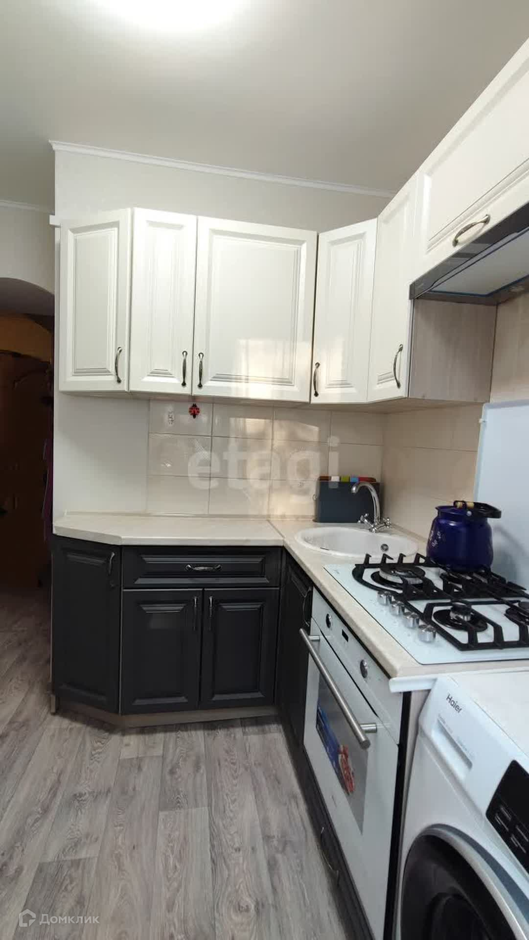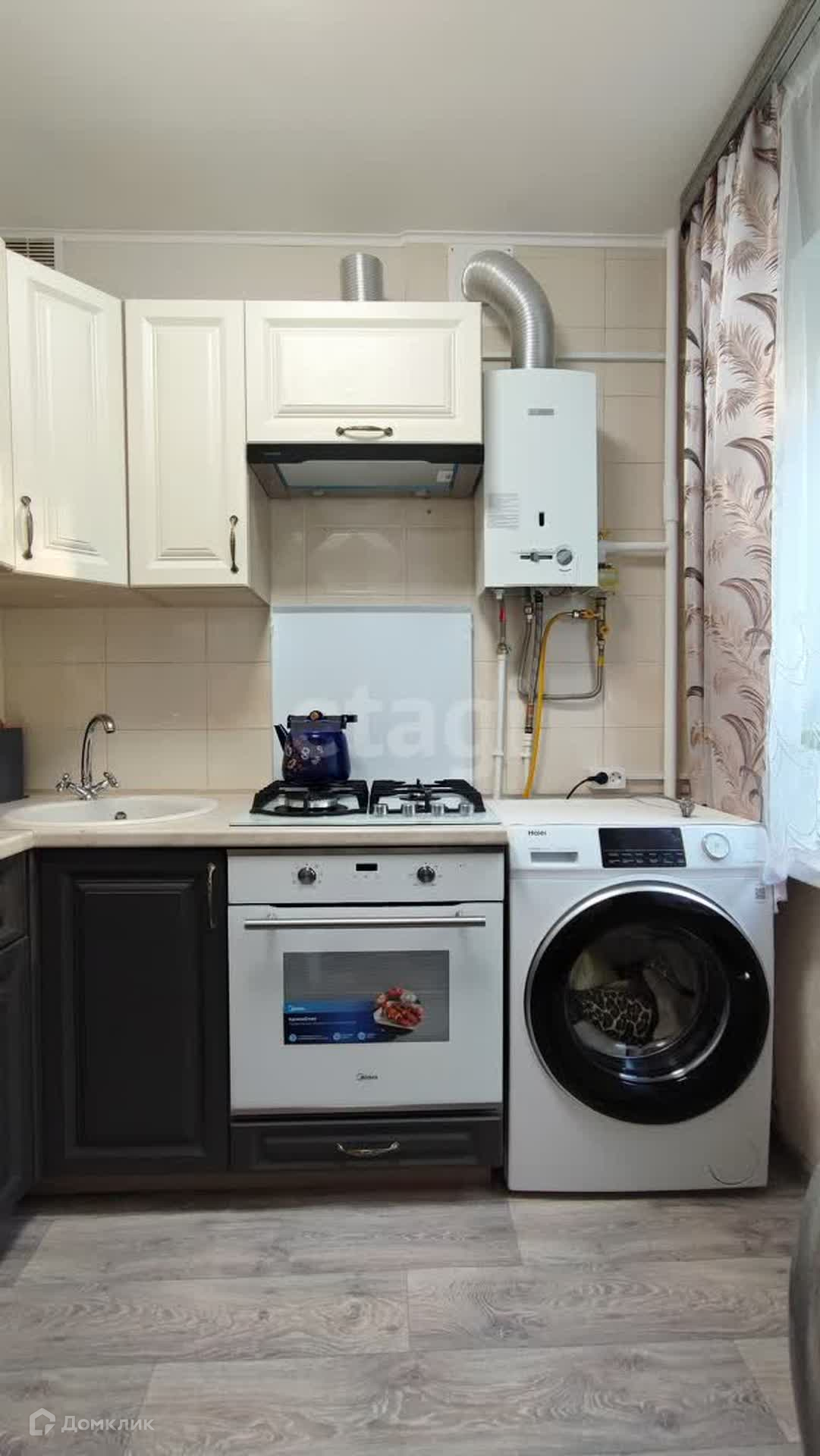 Покупателю останется современный кухонный гарнитур со встроенной газовой варочной поверхностью, вытяжкой и новым духовым шкафом.