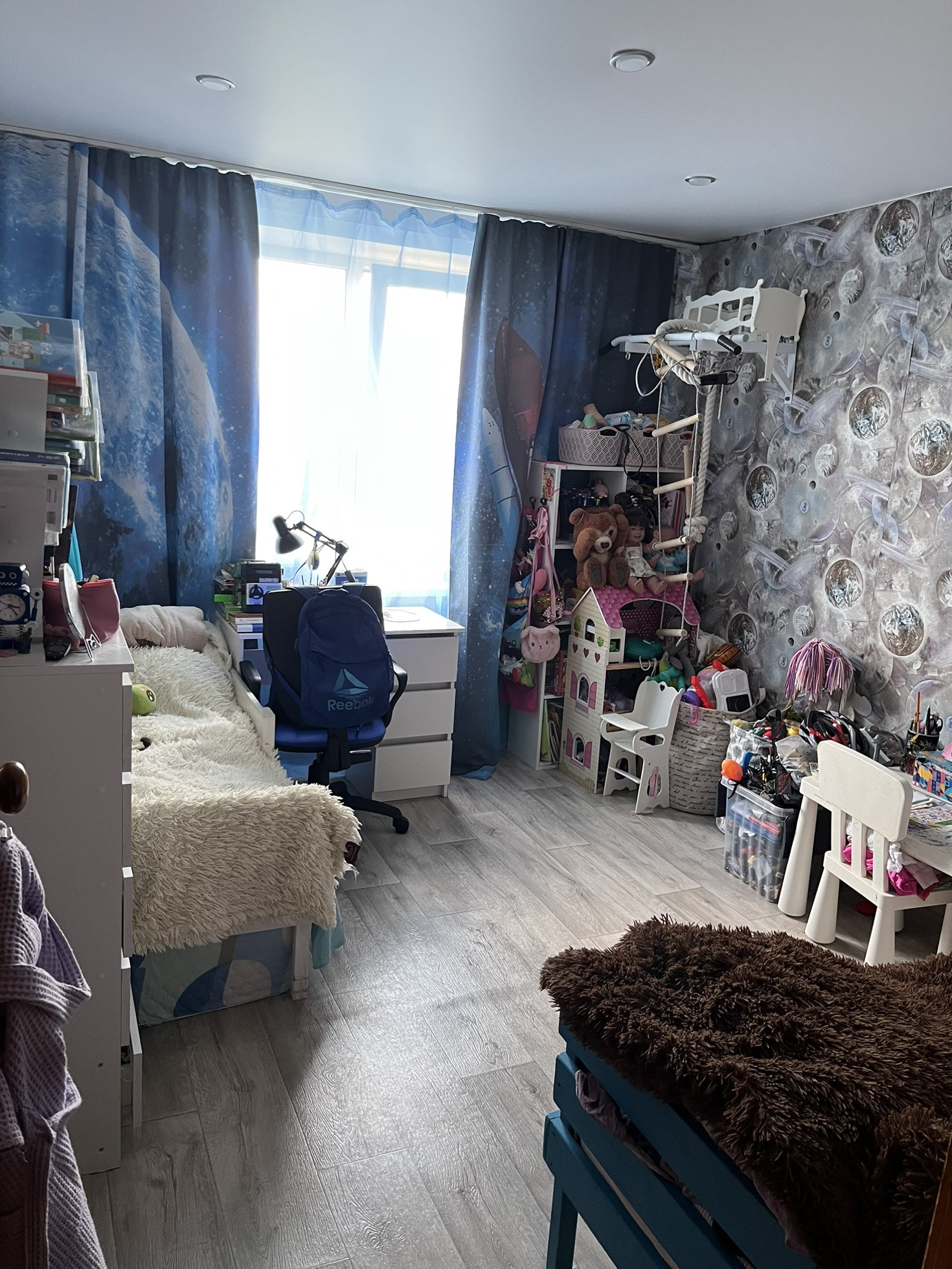 Все окна и лоджия с пластиковыми окнами, в комнатах и коридоре натяжные потолки. В спальне дополнительно утеплена стена с уличной стороны.