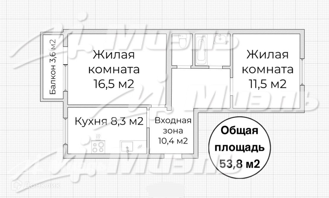 Общая площадь 53.8 м2