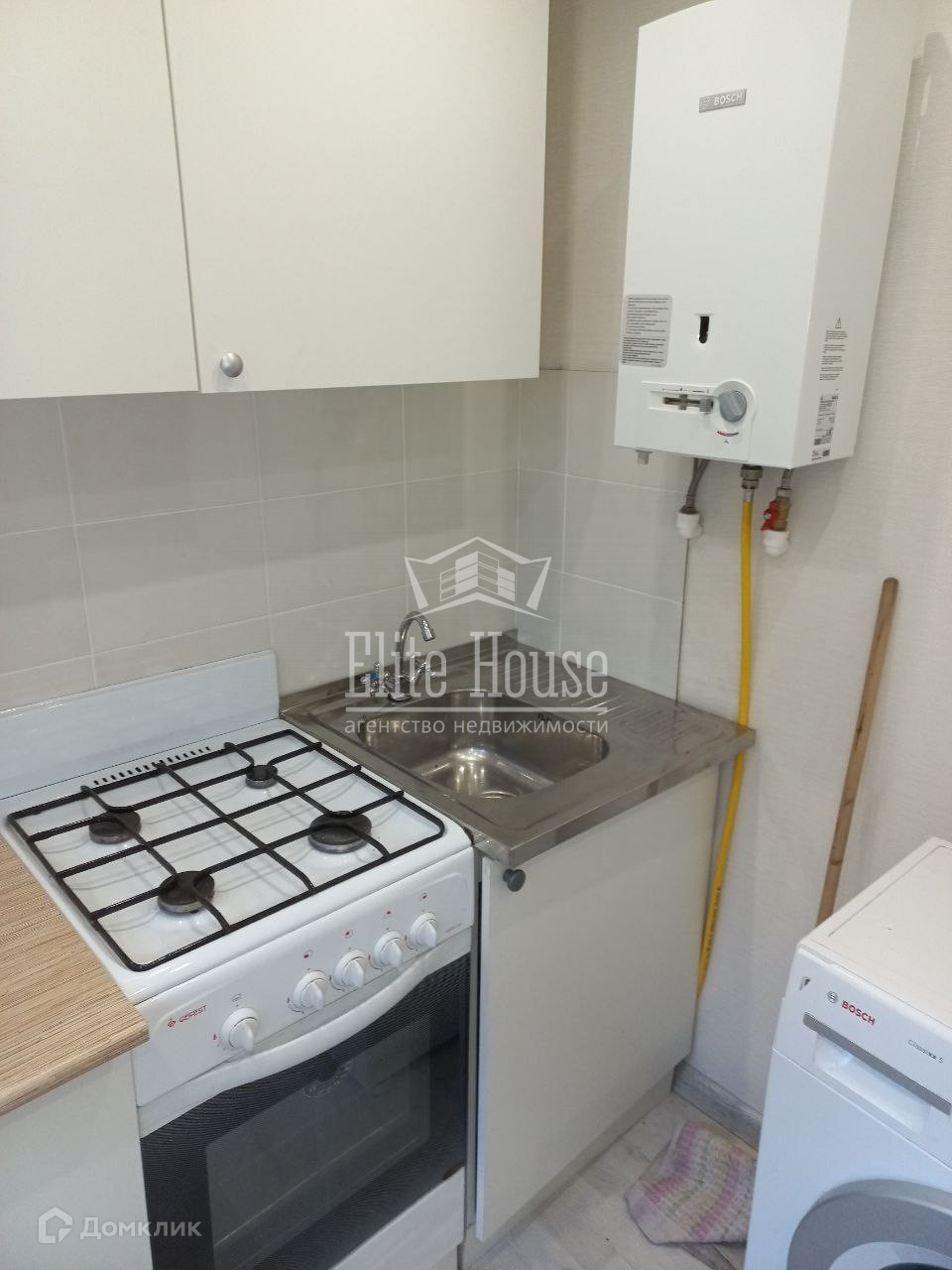 На кухне газовая плита, установлена новая газовая колонка  bоsсh. Новый кухонный гарнитур, стиральная машинка и холодильник.