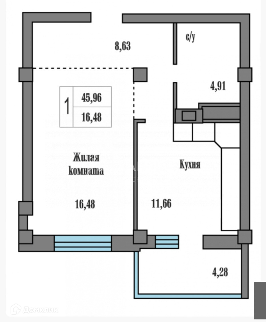 Жилая площадь 16.48 м2