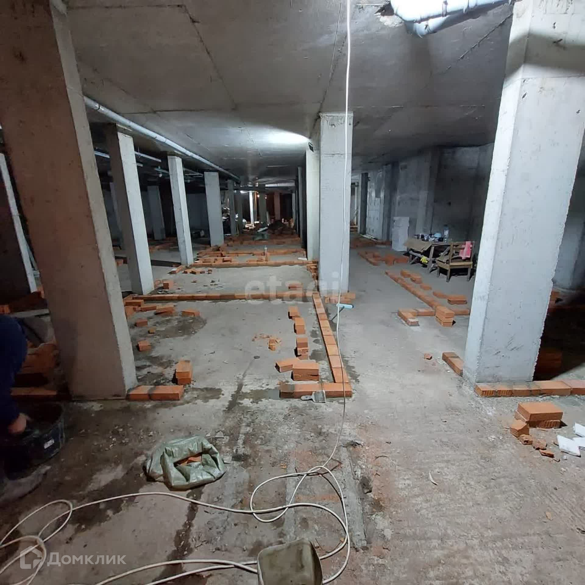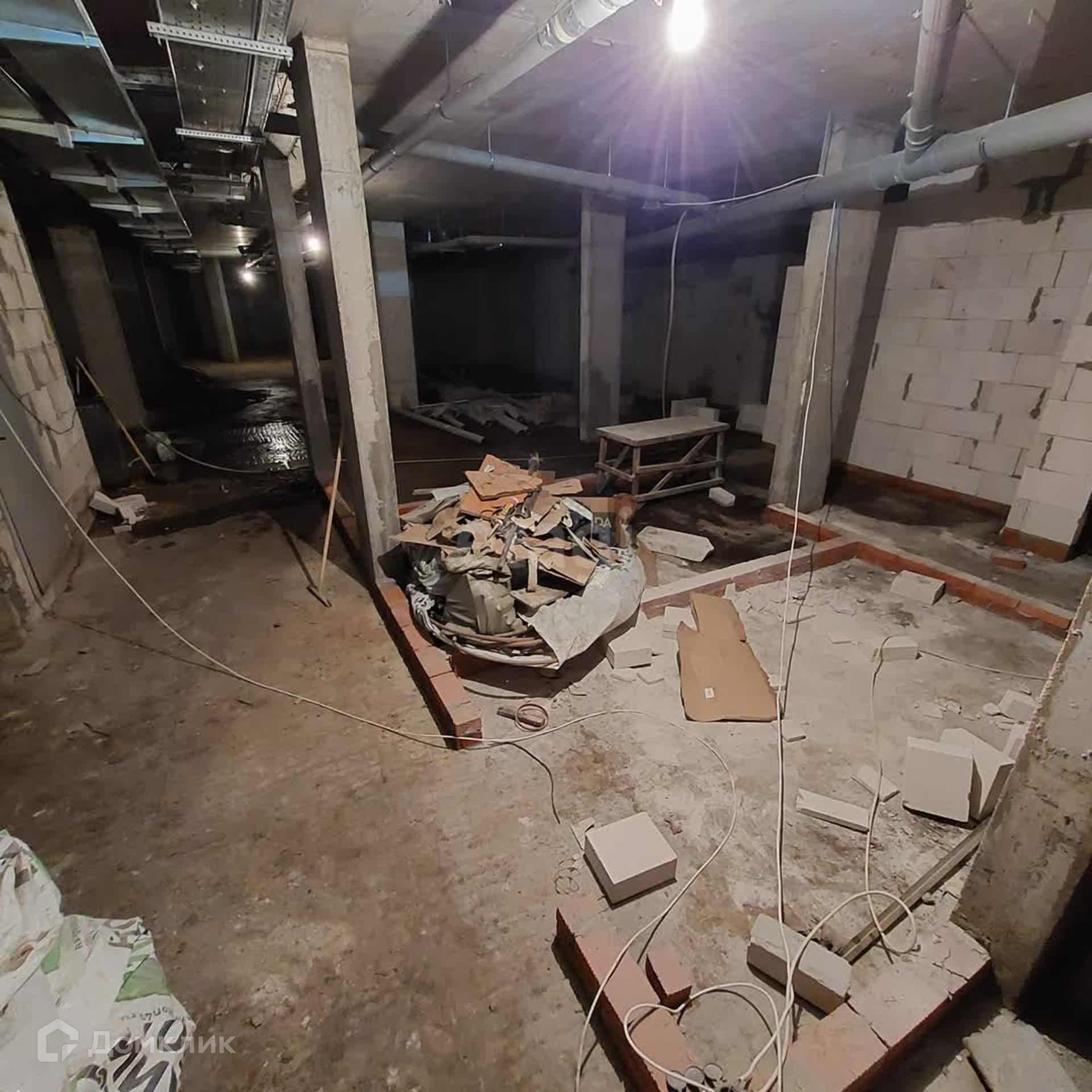 Тип этажа - подвал. Помещение продается в черновой отделке. По потолку проходят инженерные коммуникации дома - водоснабжение и канализация, узел интернет-провайдера. Отдельная комната отведена под электрощитовую. По потоку проложен кабель, светильники не подключены.