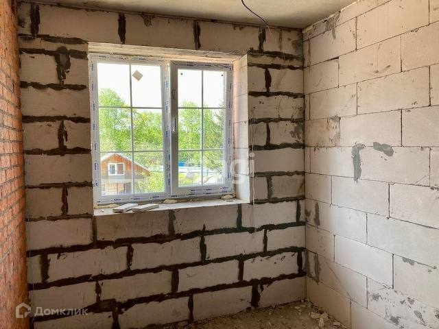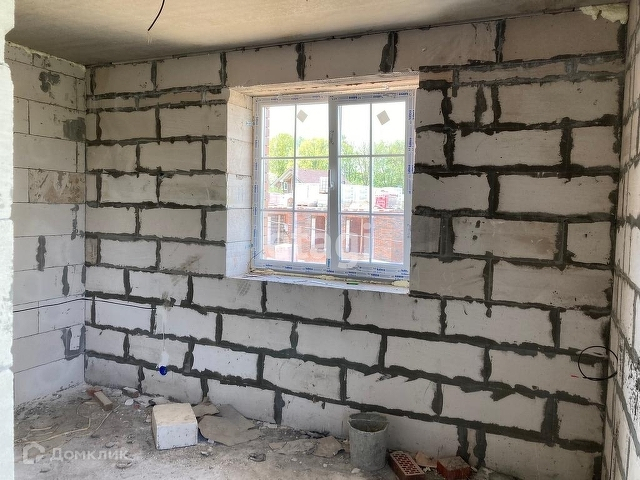 Построен из газаблоков, облицован кирпичом.