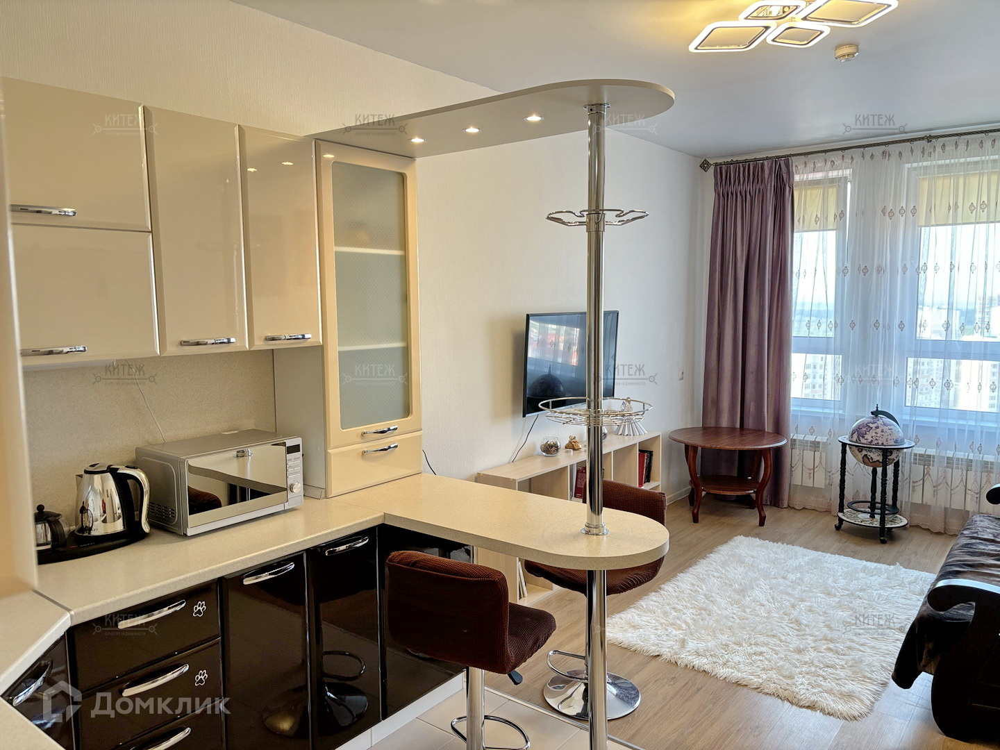 Квартира полностью обставлена мебелью и техникой. Кухонный гарнитур с барной стойкой, варочная панель, духовой шкаф, микроволновая печь. Холодильник. Стиральная машина с сушилкой.