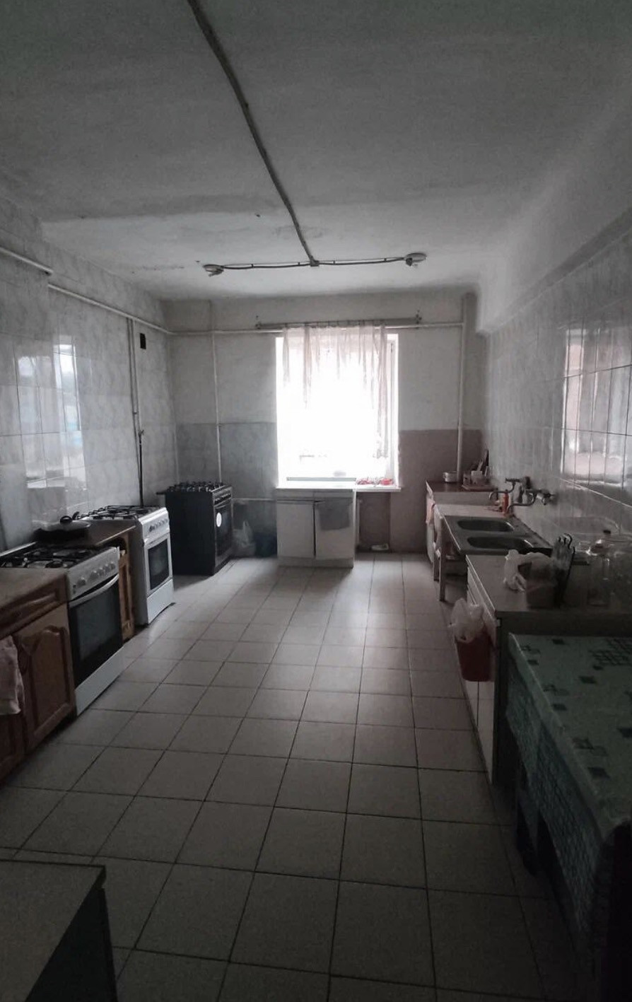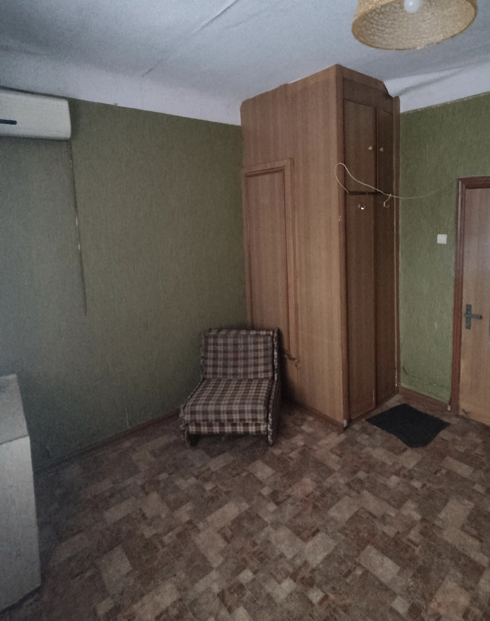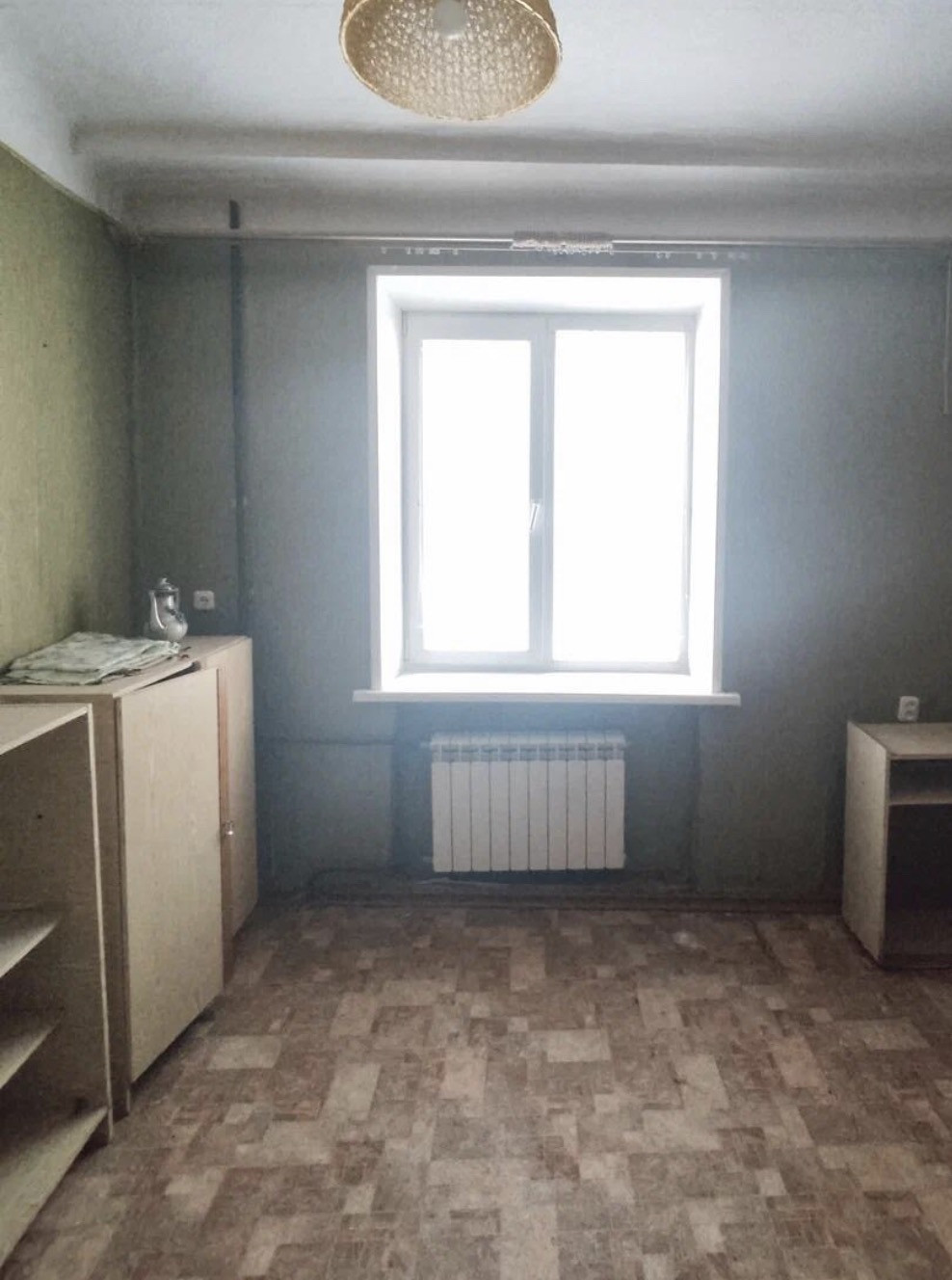 в общежитии, площадью 12.8 м.кв. В районе креста, на 3 этаже, в комнате есть кондиционер, встроенный шкаф, пластиковые окна, жалюзи