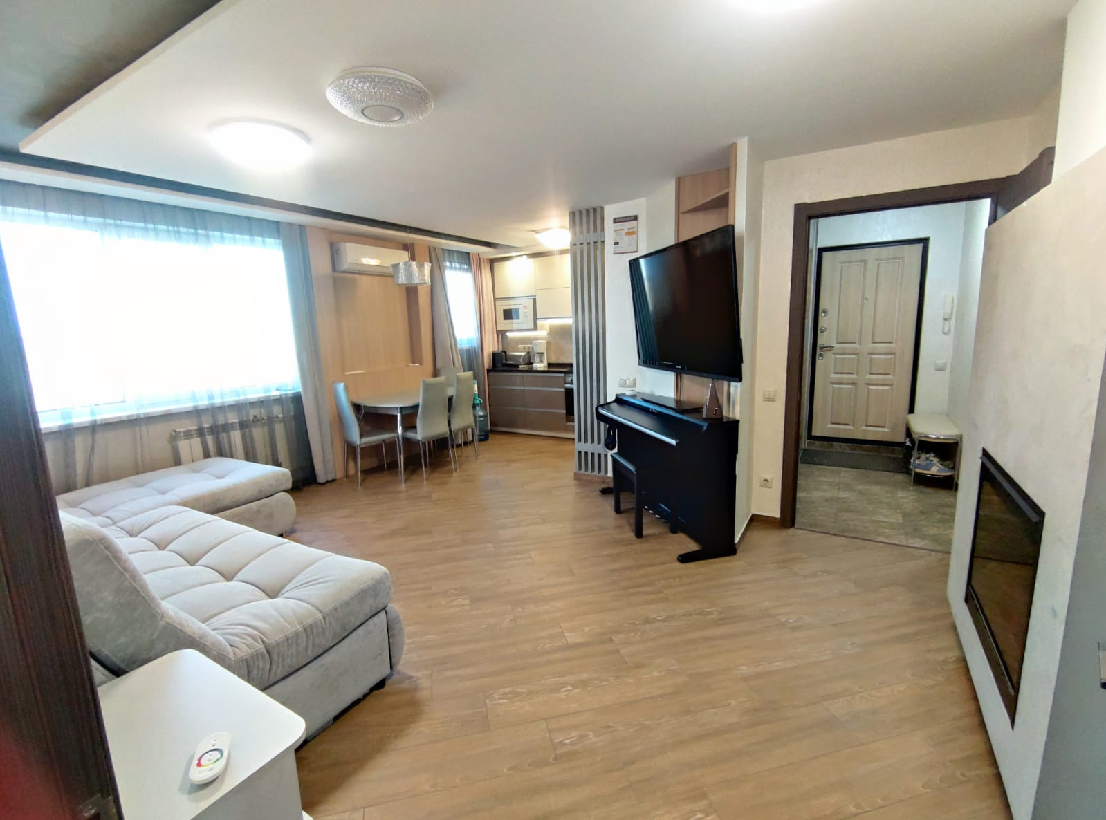 Потолки натяжные. Камин для уютных вечеров (электрический, не только красиво, но и тепло). Освещение с пультом управления. В коридоре объемный шкаф-купе.