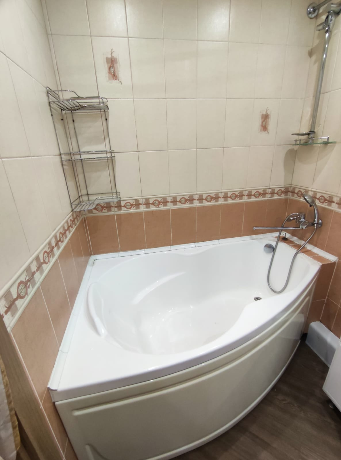 В санузле большая угловая ванна, раковина, унитаз, стиральная машинка, водонагреватель.