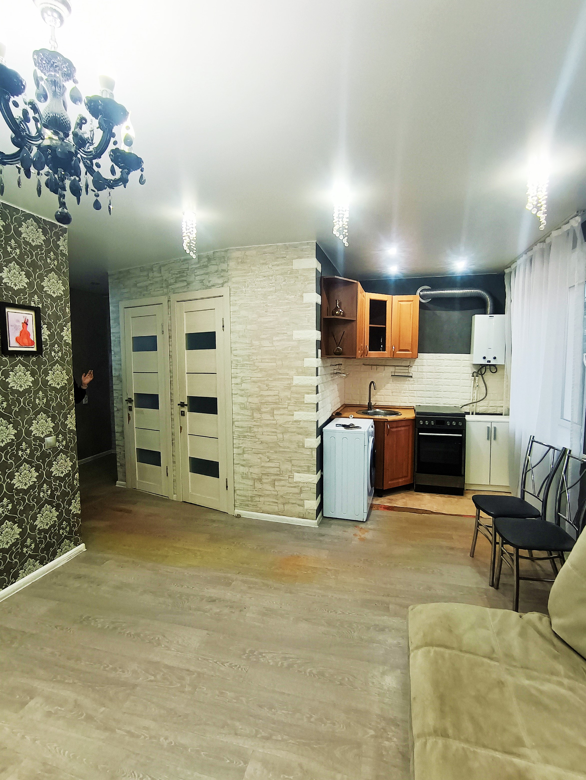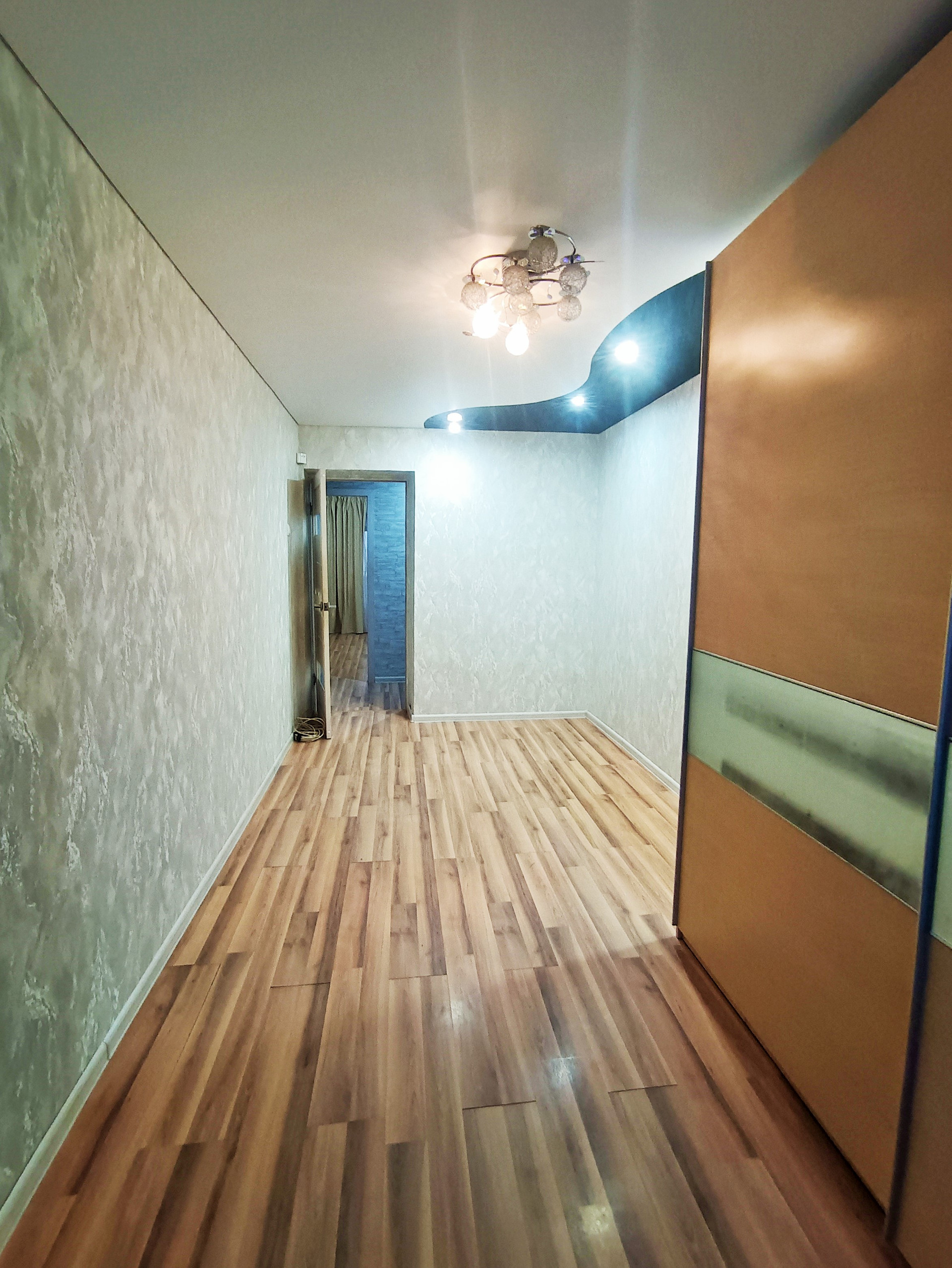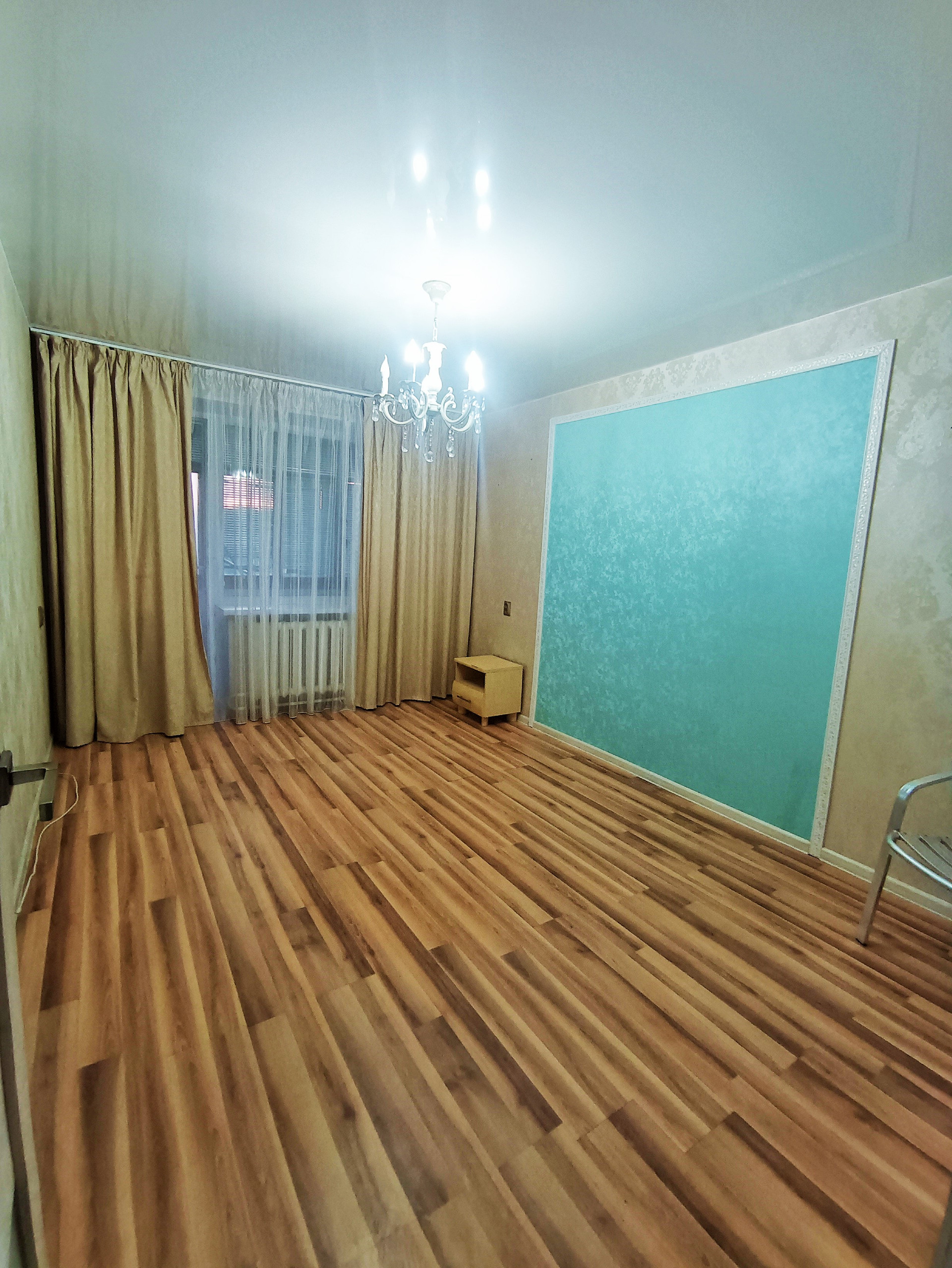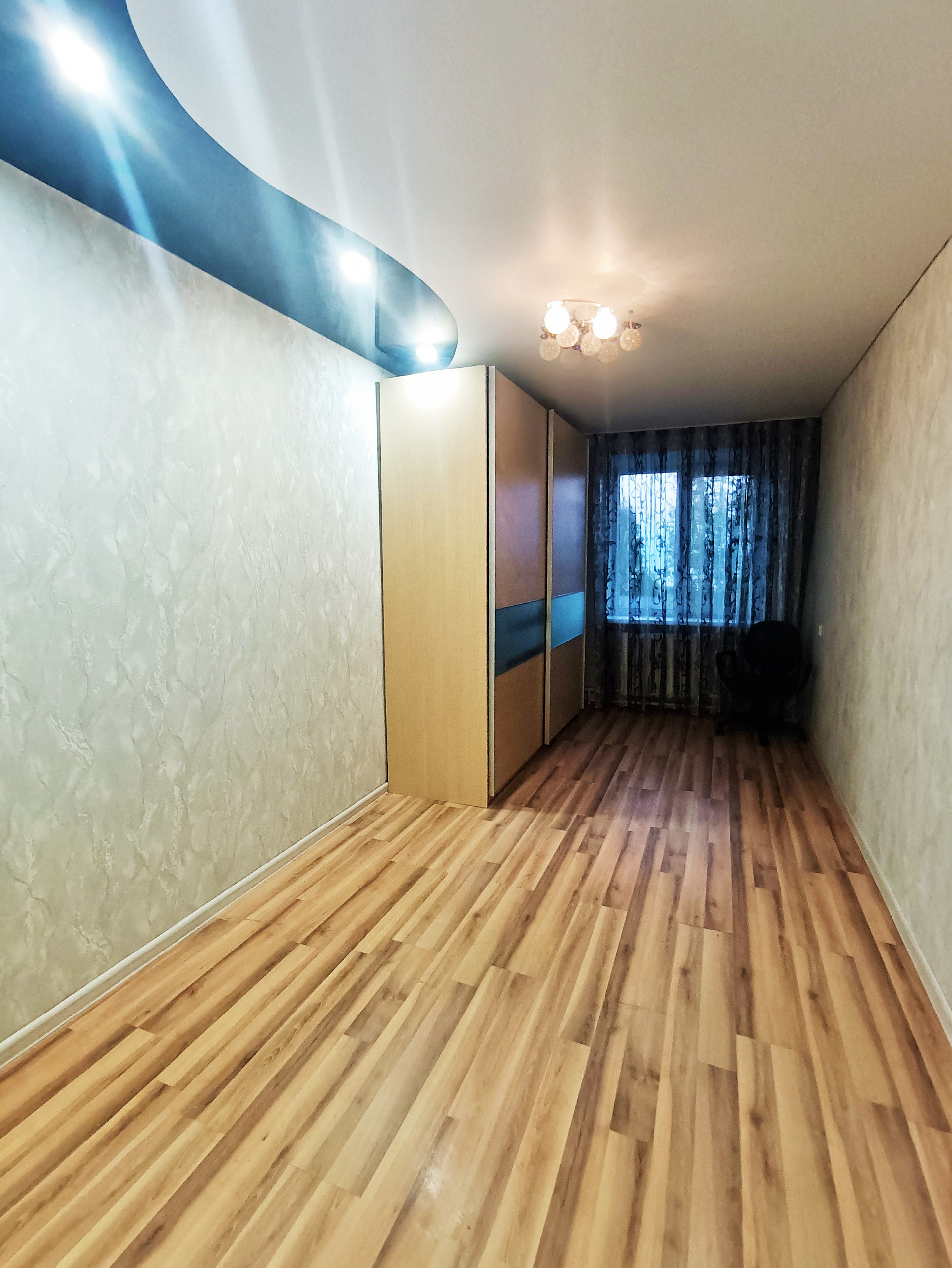 Балкон остеклён деревянными окнами, которые выходят во двор. Стены в квартире выровнены и оклеены красивыми обоями. На полу лежит линолеум. Во всей квартире натяжные потолки.