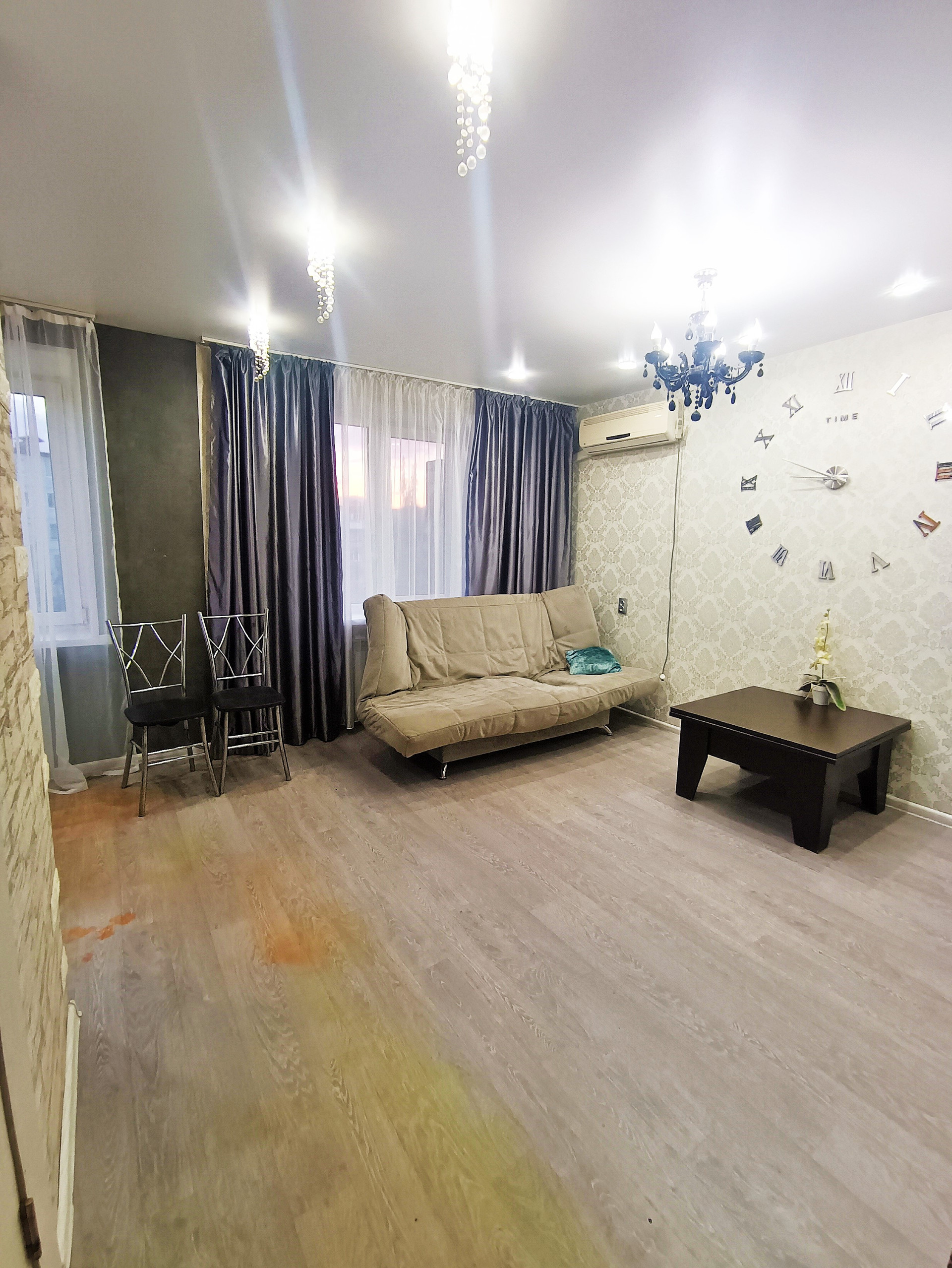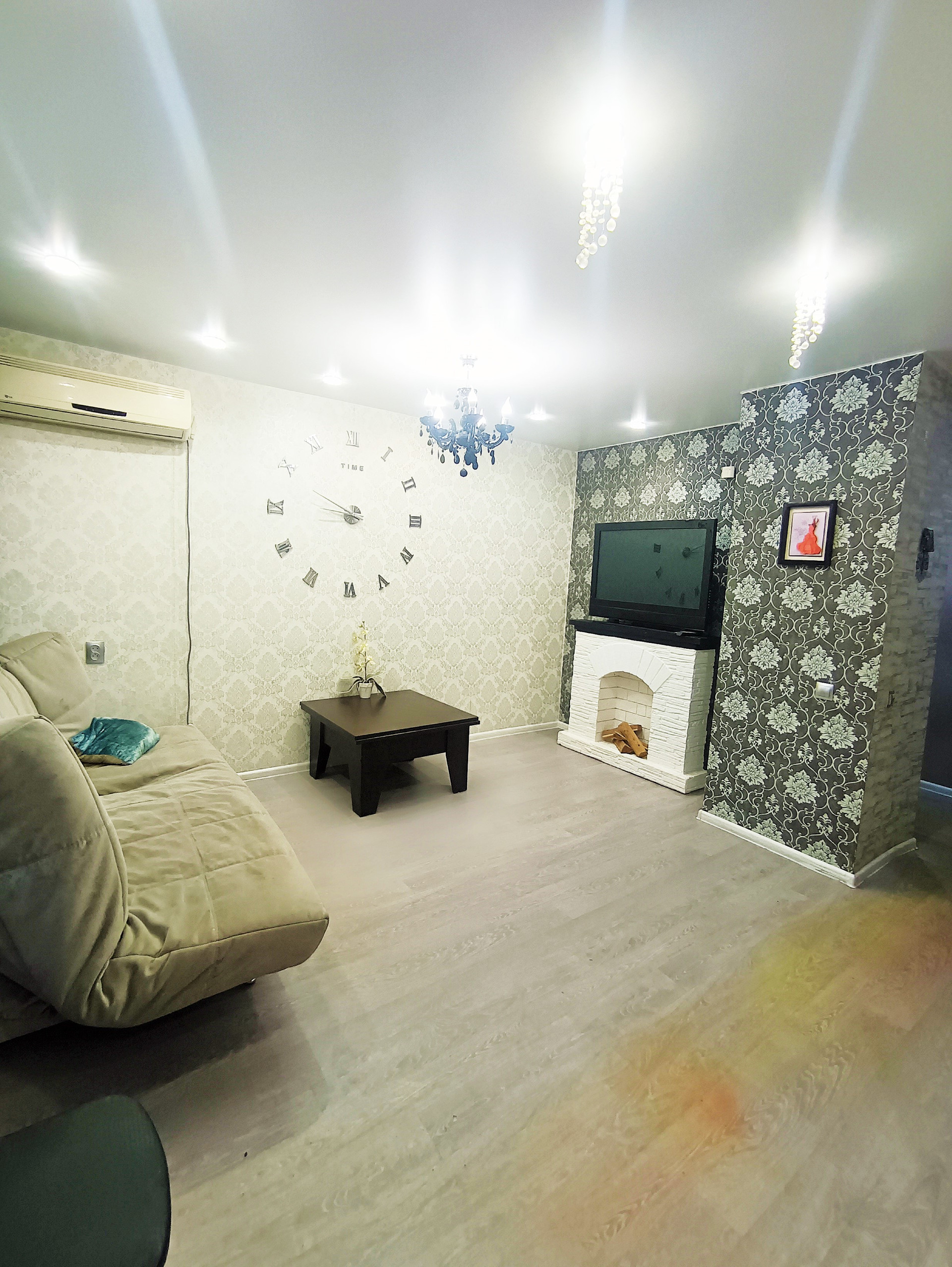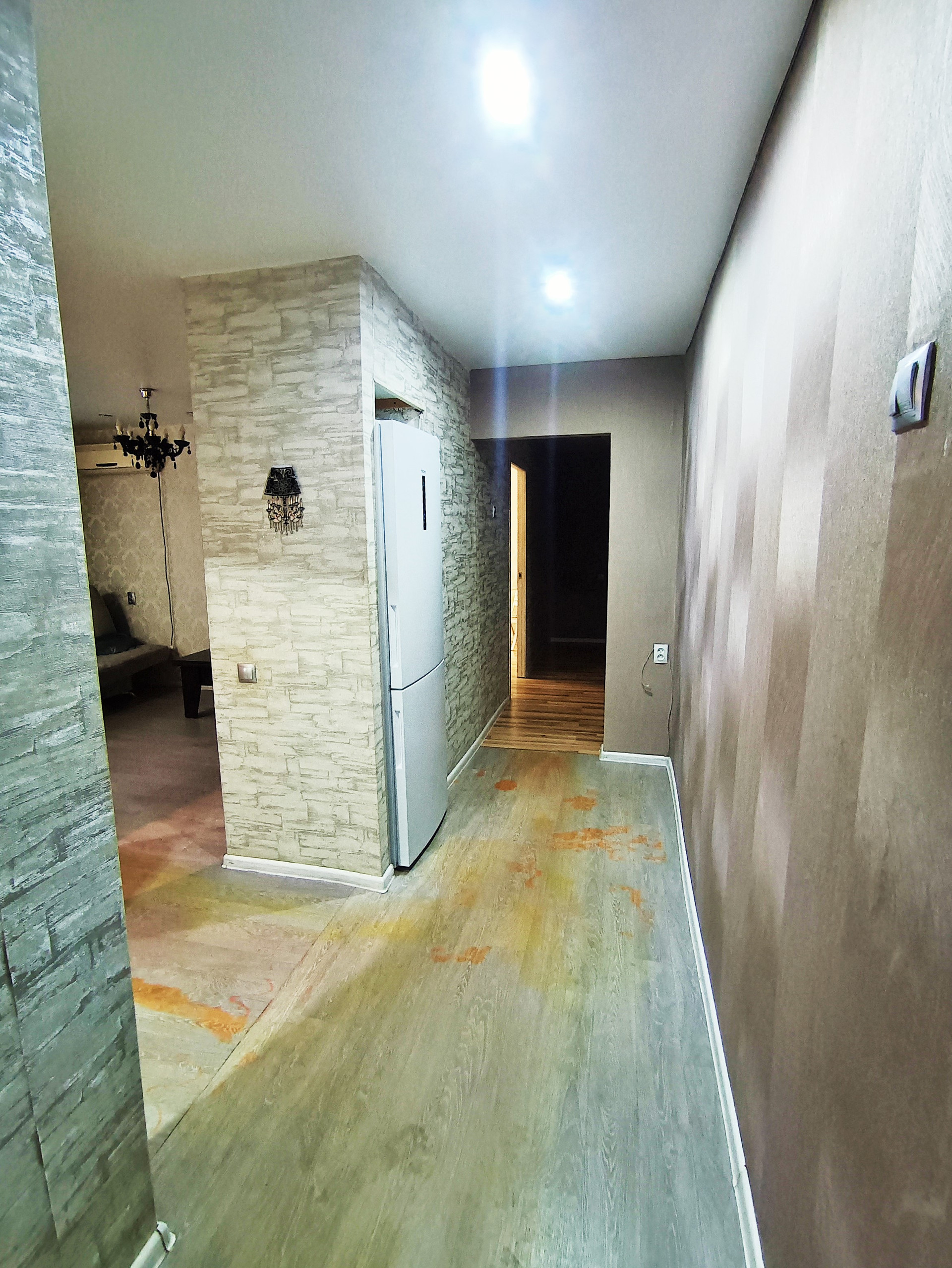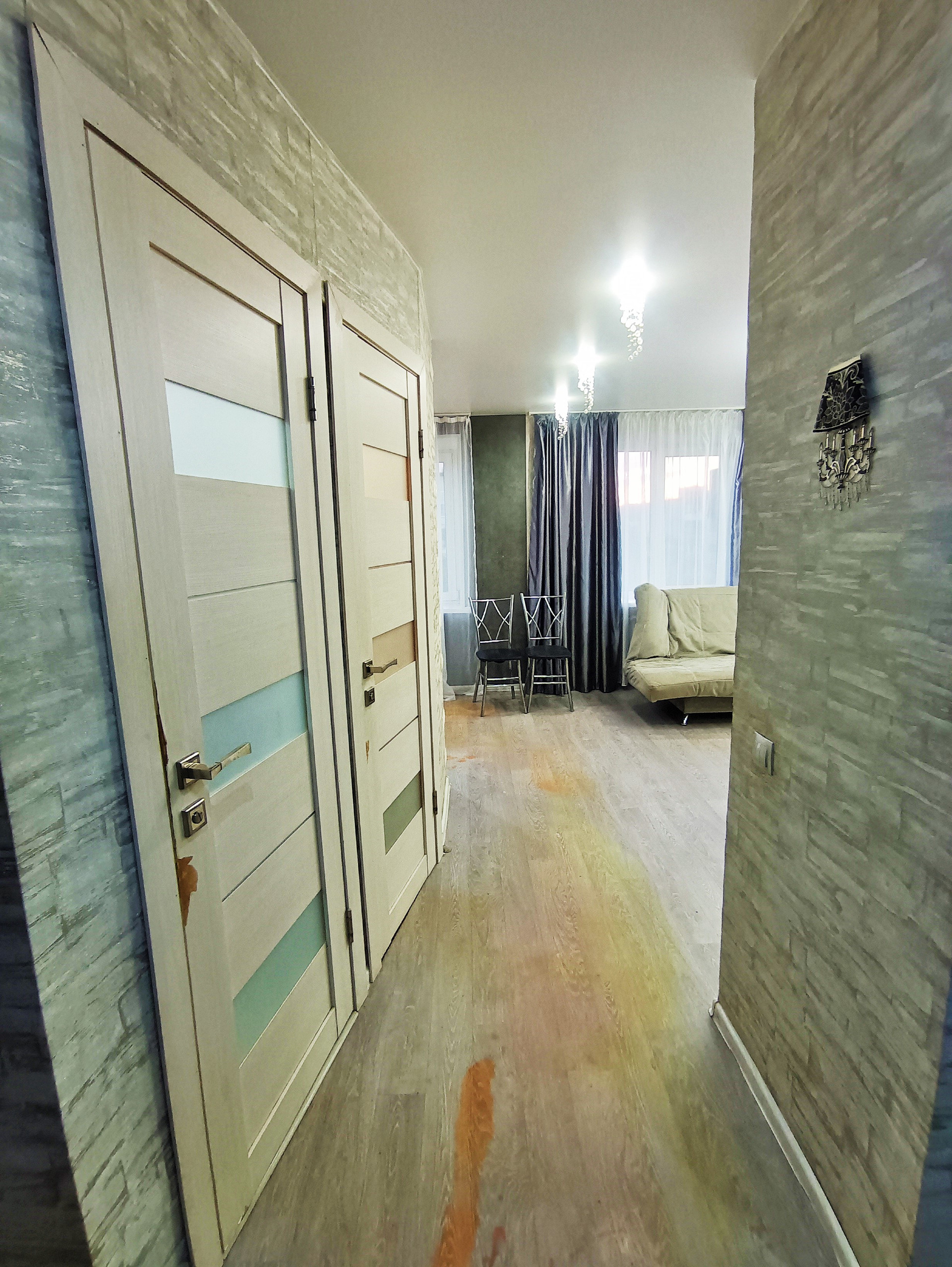 Балкон остеклён деревянными окнами, которые выходят во двор. Стены в квартире выровнены и оклеены красивыми обоями. На полу лежит линолеум. Во всей квартире натяжные потолки.