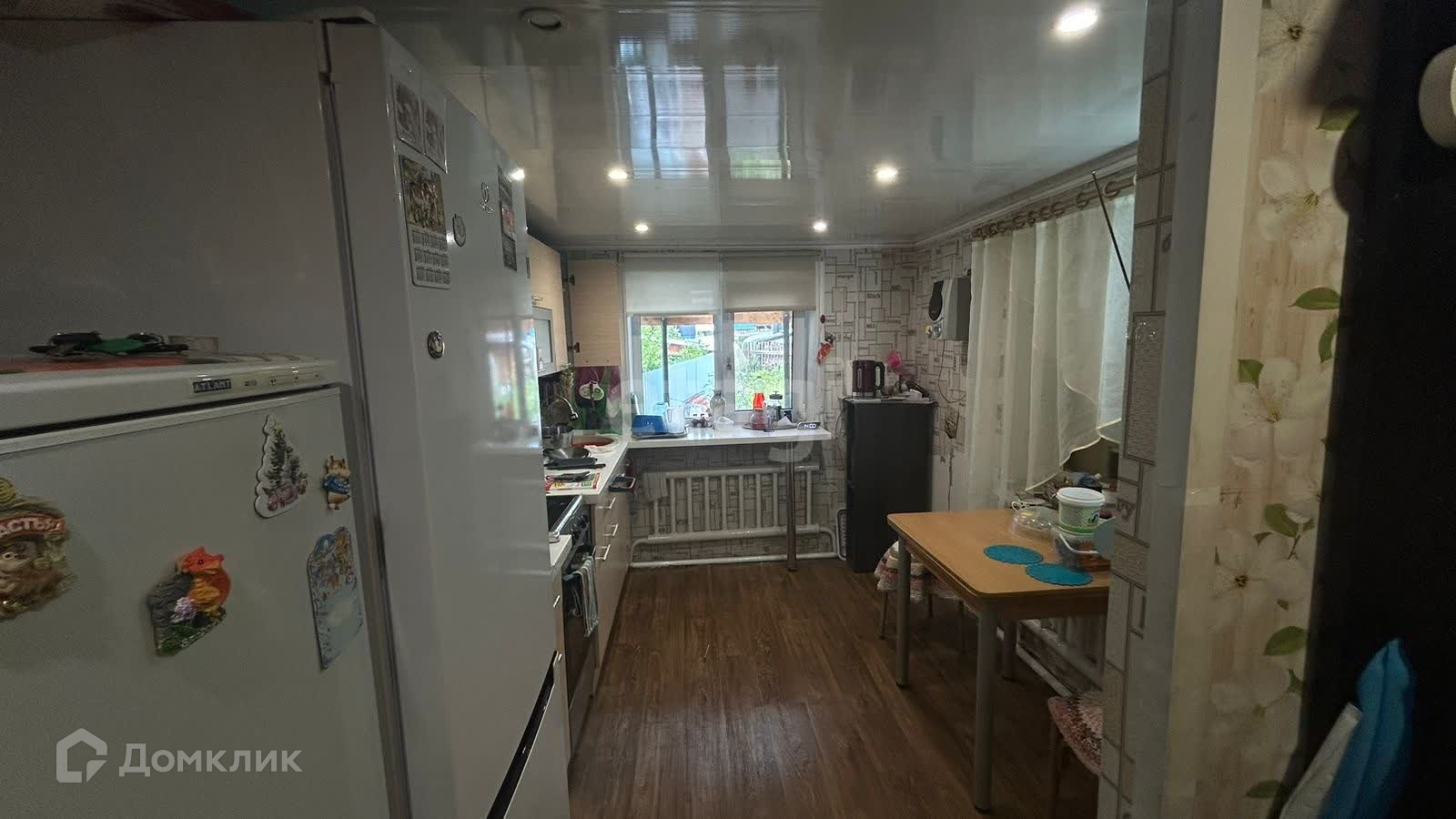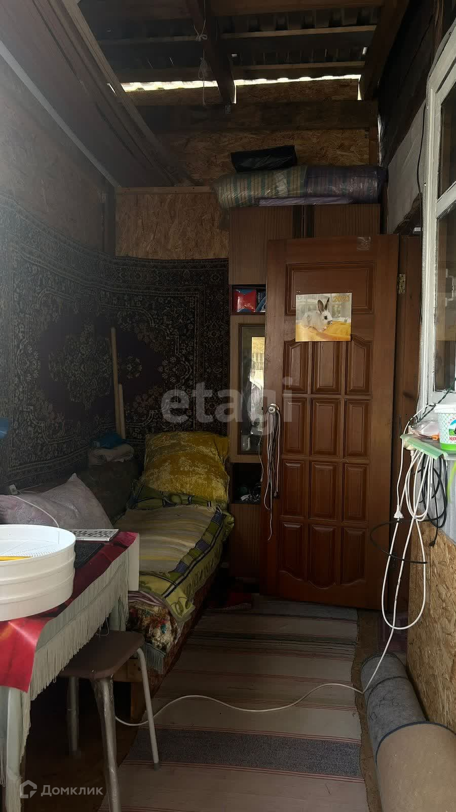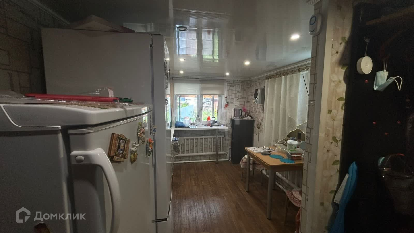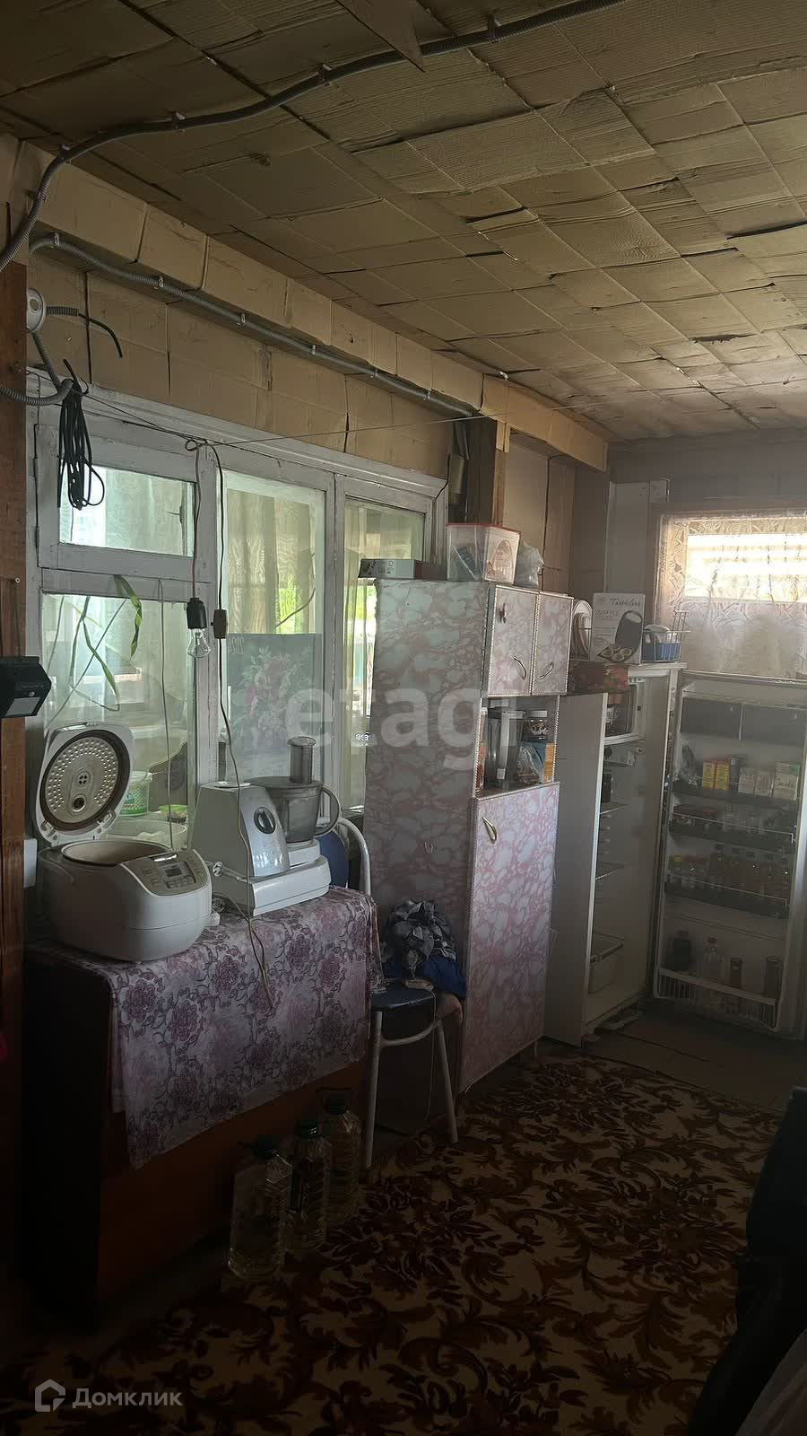 Состоит из одной комнаты и кухни ,есть натяжной потолок. Имеется пристрой (летняя кухня, веранда). Электричество заведено в дом, отопление центральное. В доме холодная вода, скважина-вода заведена в дом. Действующая выгребная яма, сан.узел в доме.