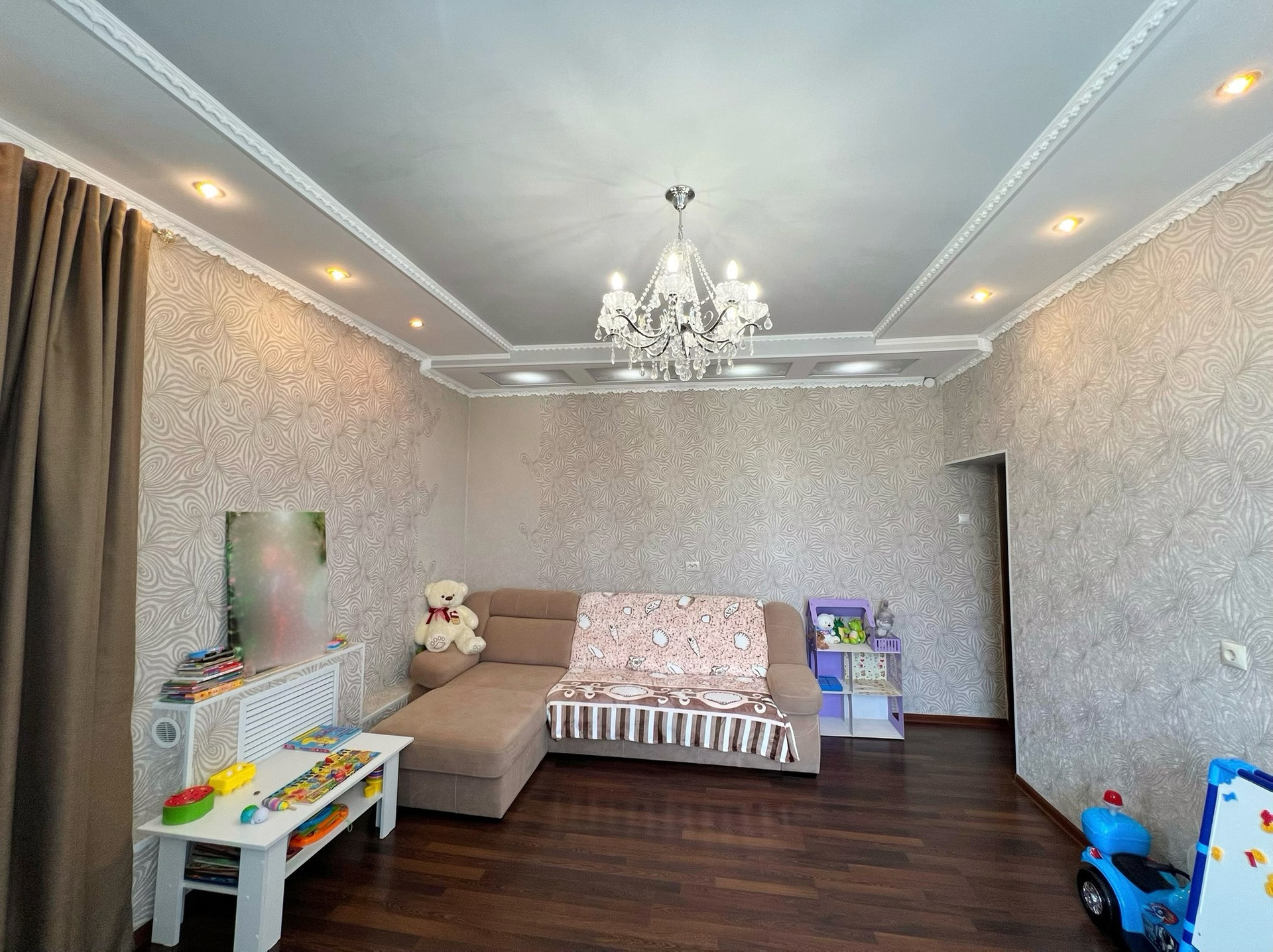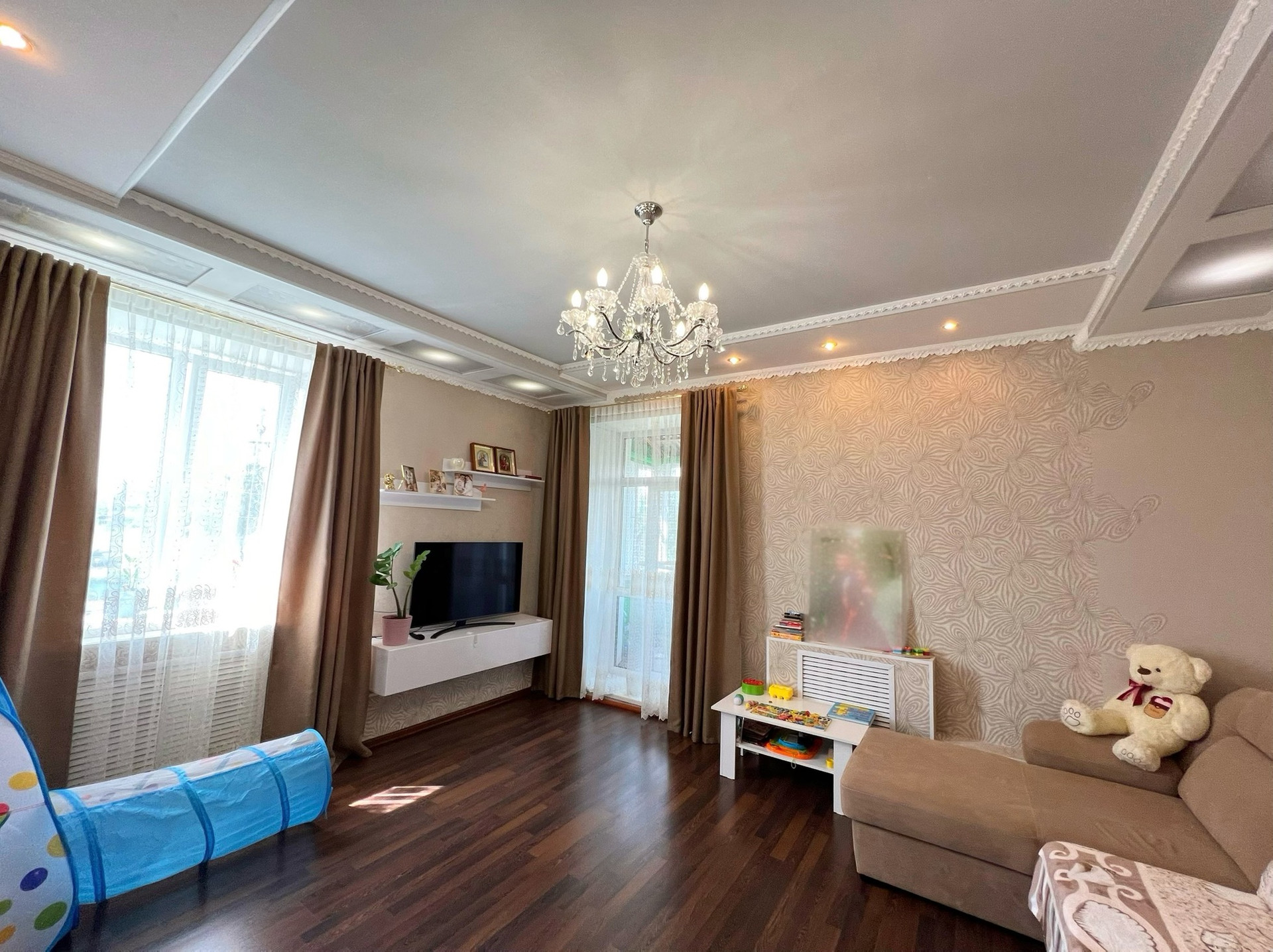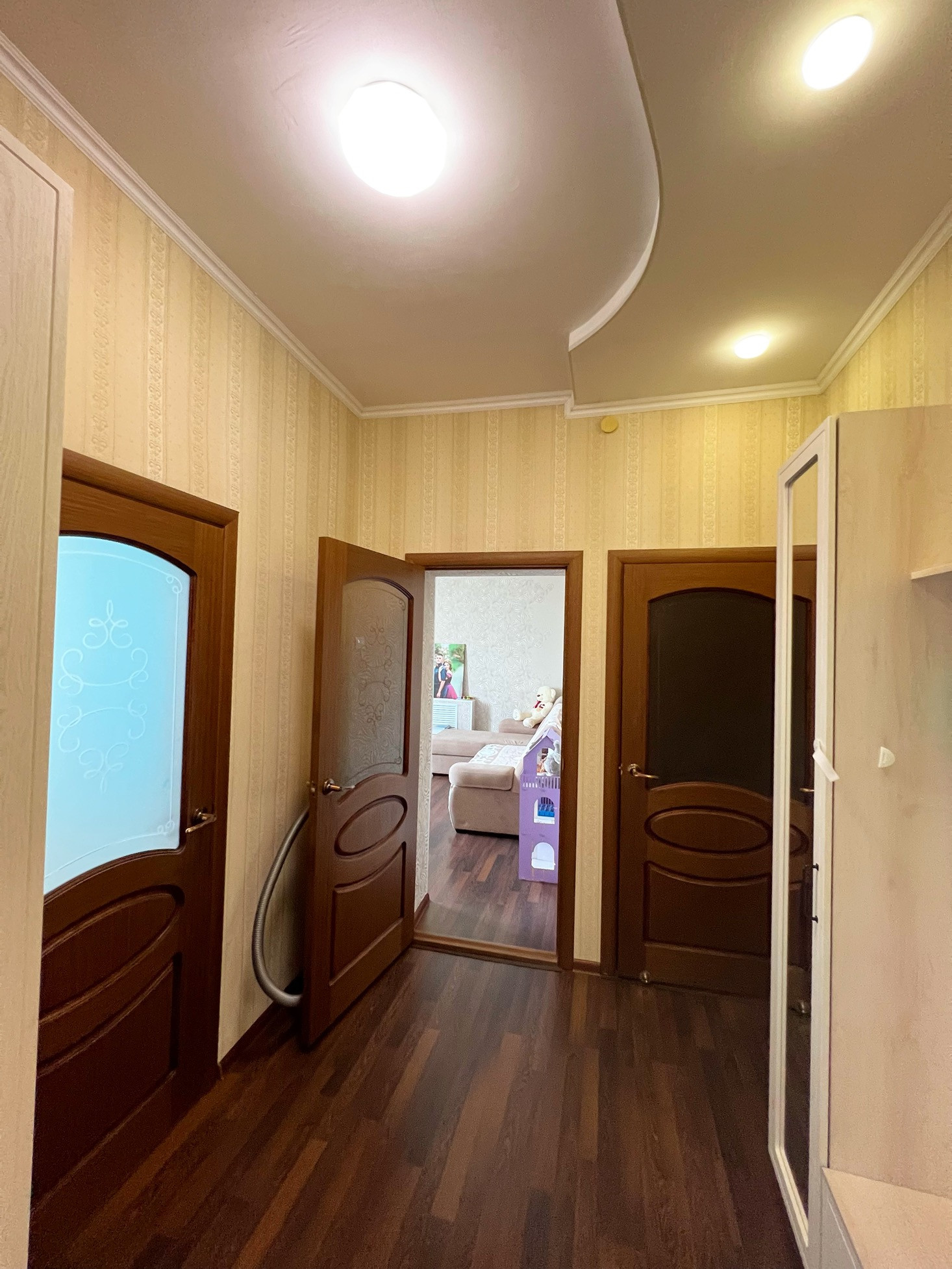 Площадь 70 кв.м., этаж 2/2. В квартире сделан качественный ремонт, ламинат, двухуровневые потолки, межкомнатные двери, пластиковые окна, санузел в кафеле.  В ванной и детской комнатах сделан теплый пол. Квартира улучшенной планировки, высокие потолки 3 м., изолированные комнаты, просторная кухня, лоджия.