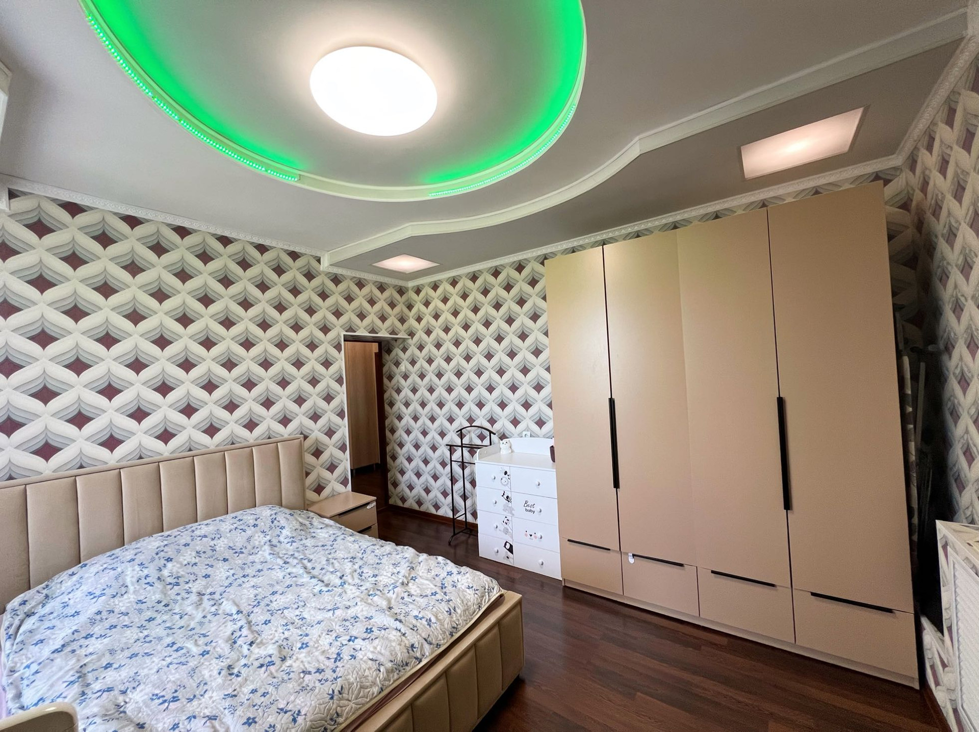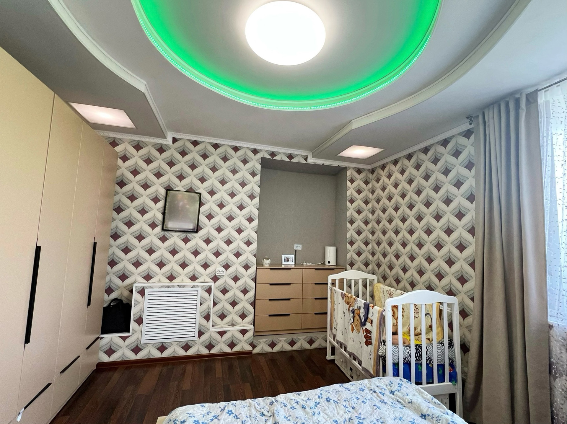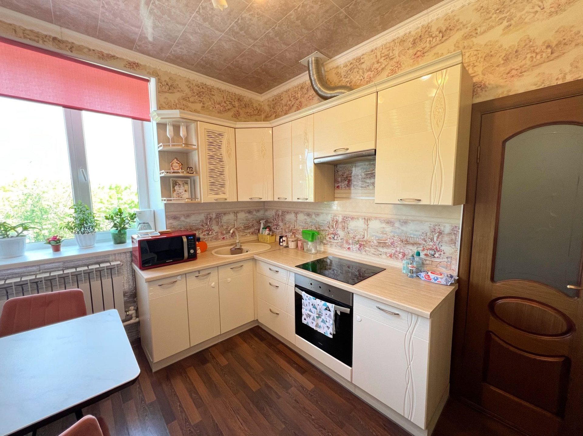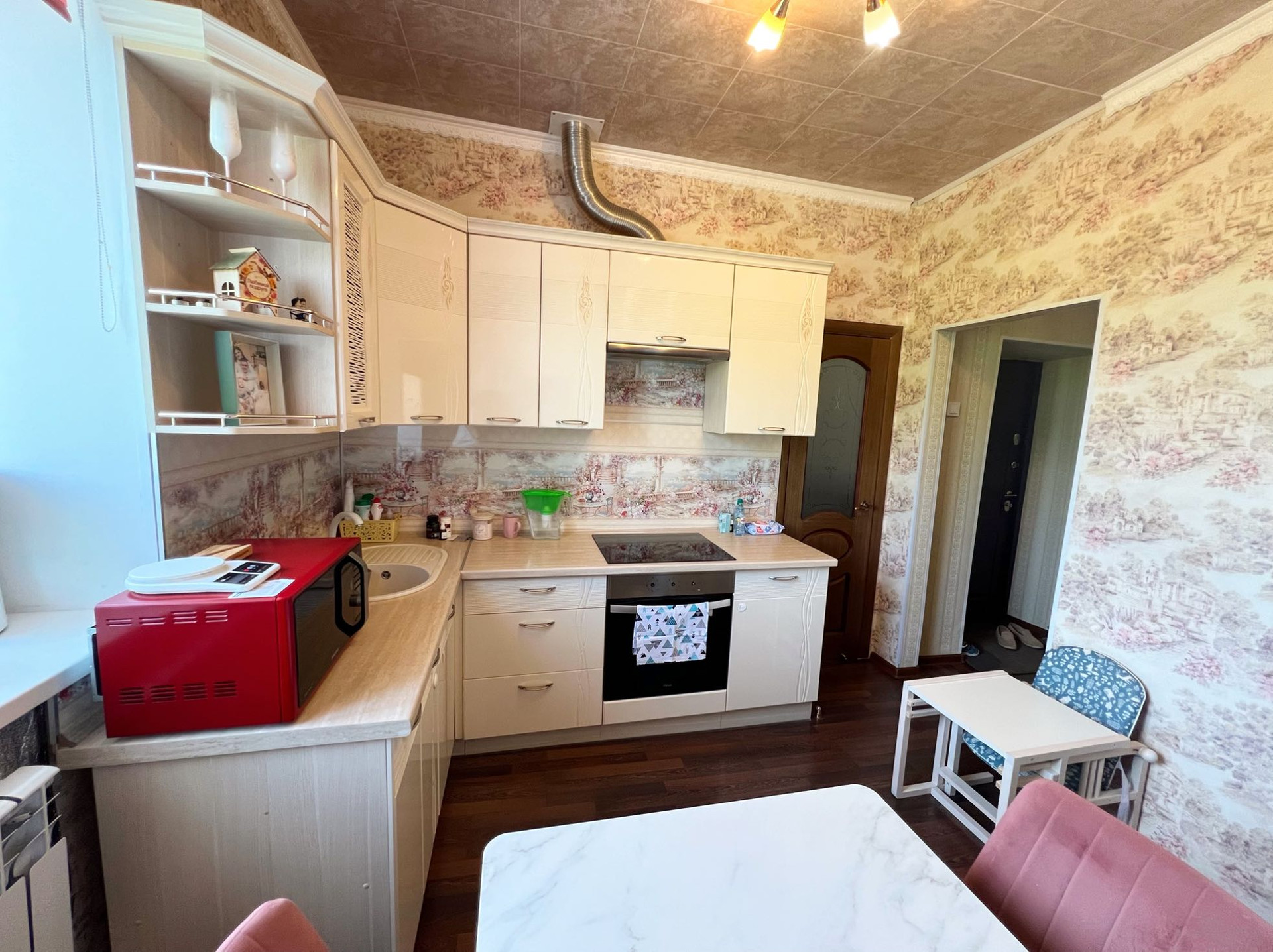 В квартире остается кухонный гарнитур с встроенной техникой, подвесная тумба под ТВ.