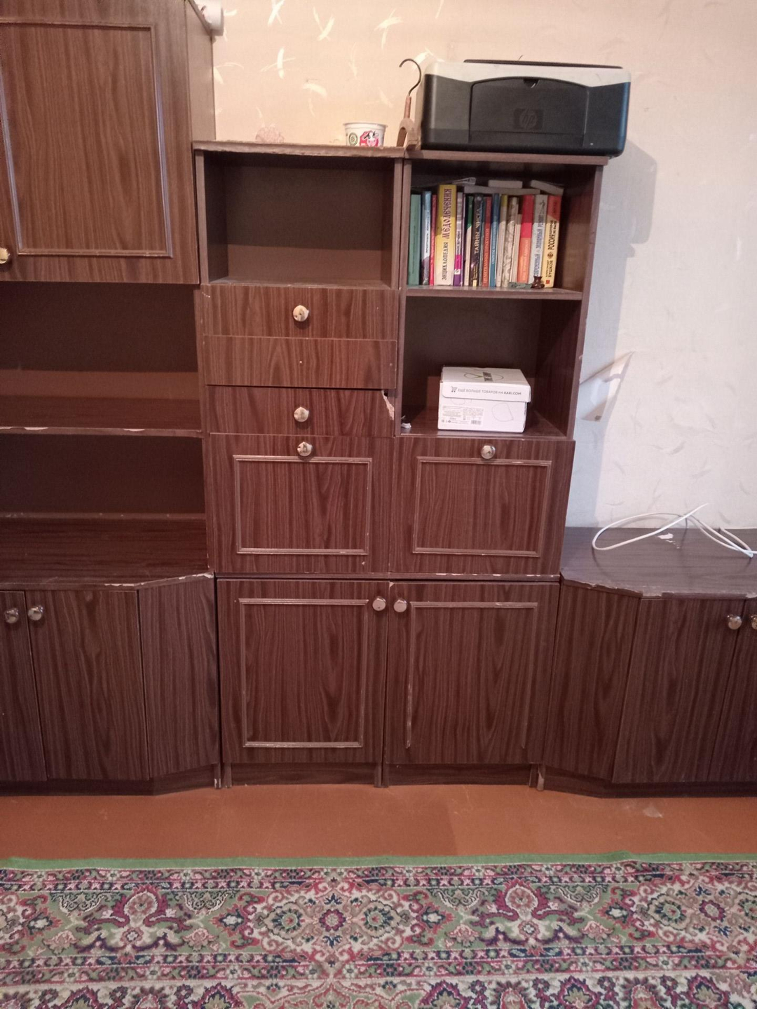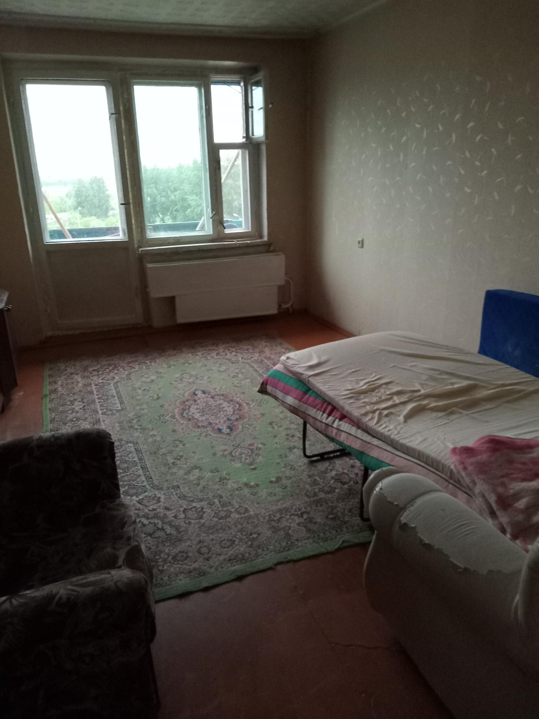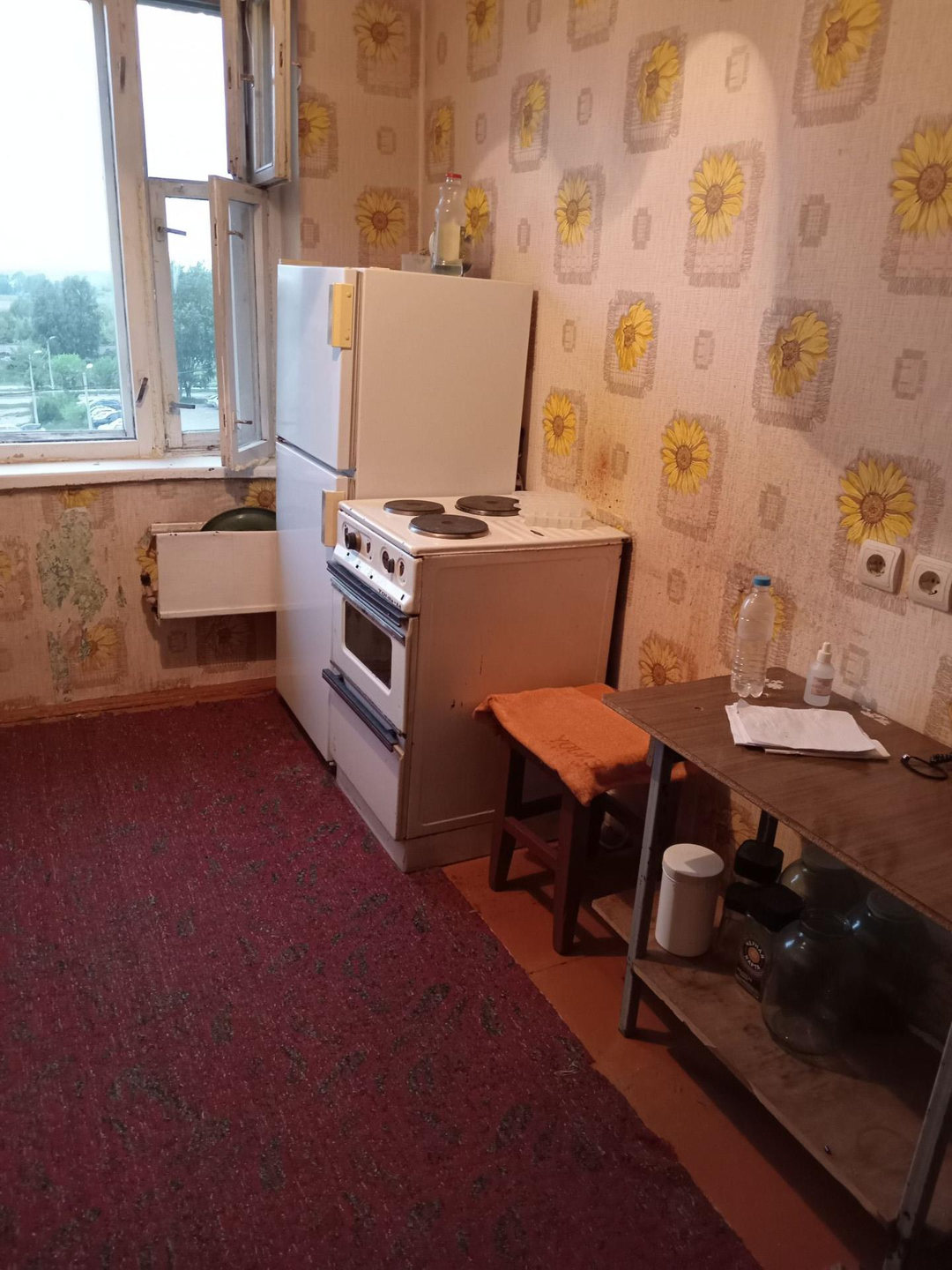 Квартира в обычном состоянии, есть холодильник и плита, но нет стиральной машины, в комнатах диваны и шкафы.