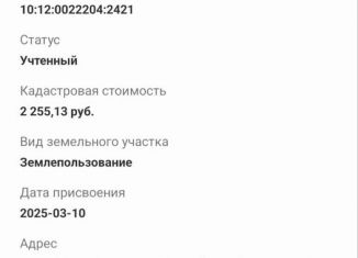 продам участок,без электричества, электричество в кооперативе проведено,нужно подавать заявление кадастровый номер 10:05:0042101:5 |