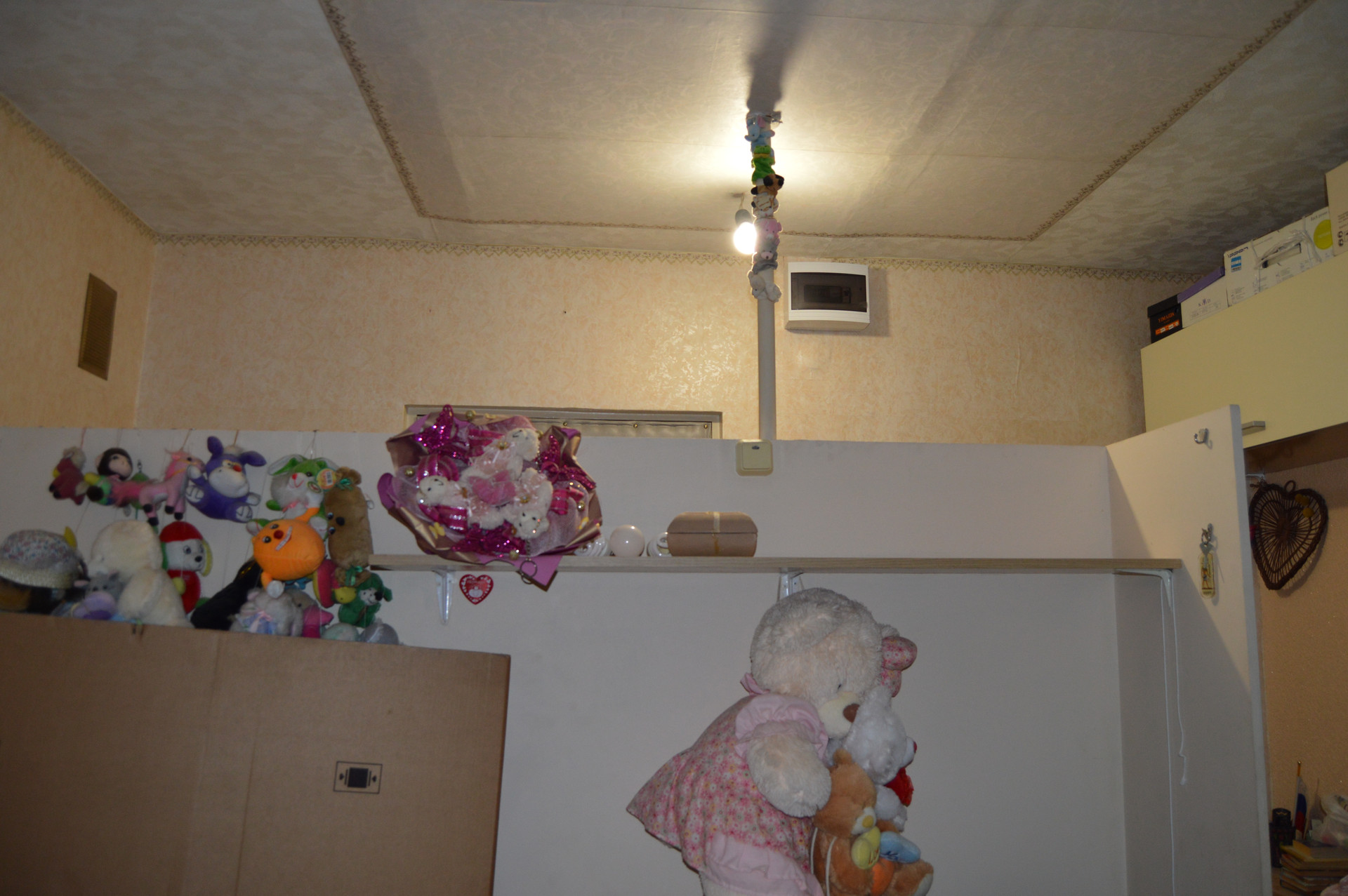 Комната правильной квадратной формы. С помощью стенки сделали зонирование комнаты и небольшого коридора.