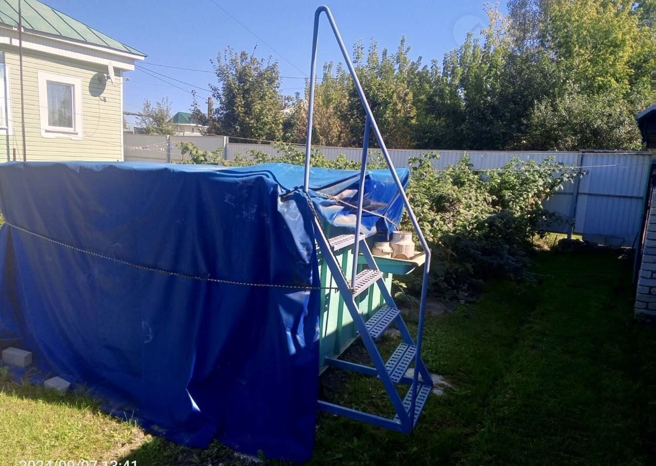 Часть земли между домом и гаражом с баней засажена малиной и смородиной. Там же, напротив бани, металлический бассейн в хорошем состоянии накрыт пологом от дождя и снега.