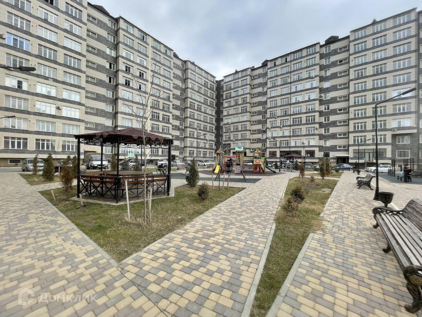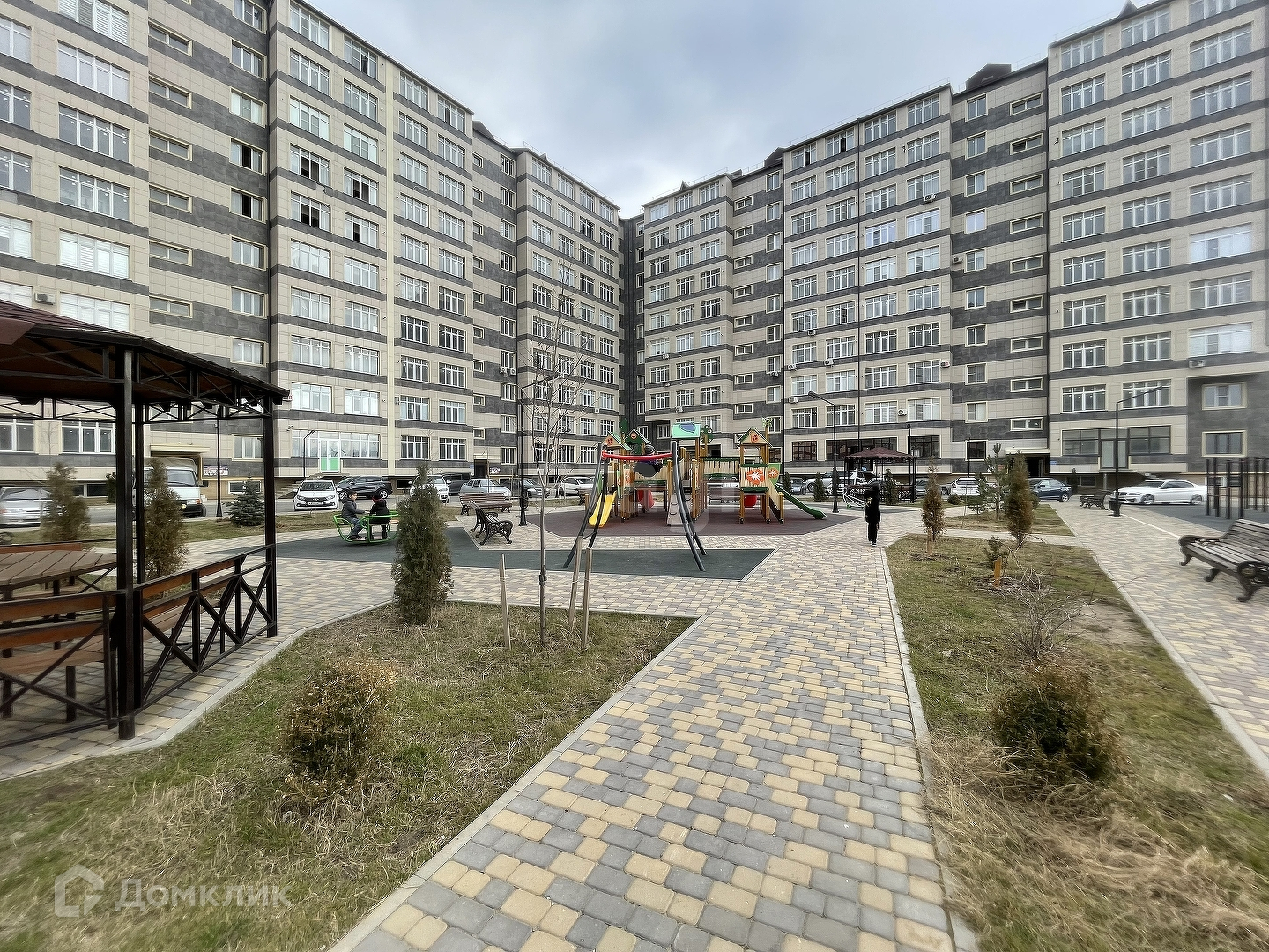 -Большой двор с парковочными местами, имеется детская площадка, беседка, мини футбольное поле во вдоре, воркаут зона