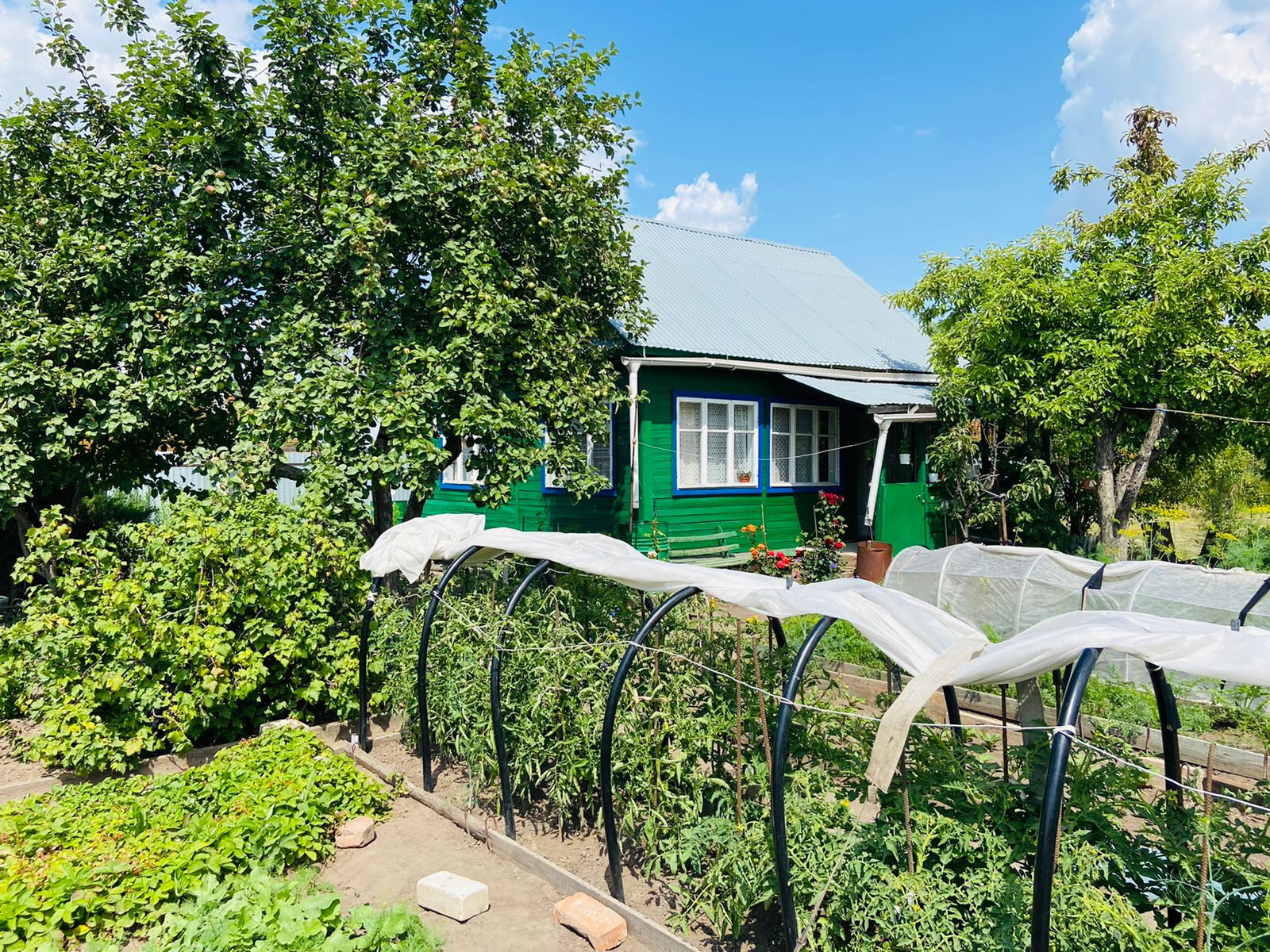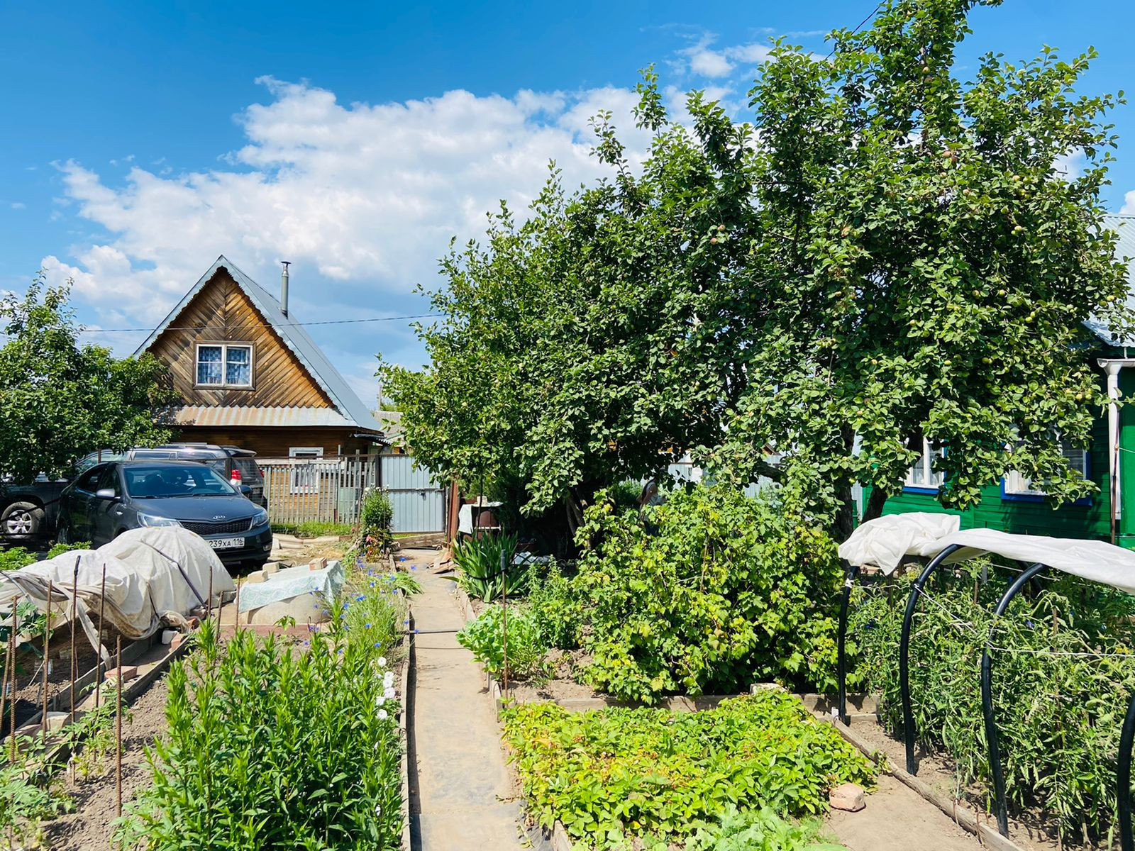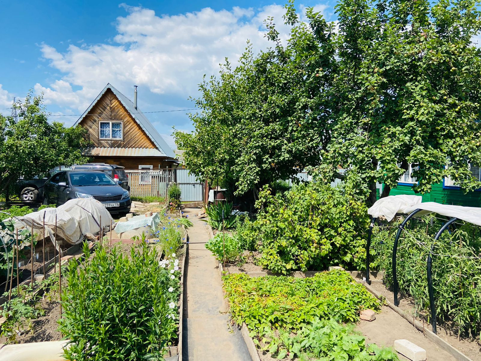 Ухоженный участок с плодово-ягодными насаждениями: яблони, синяя и желтая сливы, боярышник, кусты красной и черной смородины, крыжовник, вишни, малины, клубника, жимолость, овощи, голубая ель, сирень, жасмин , орех лесной.