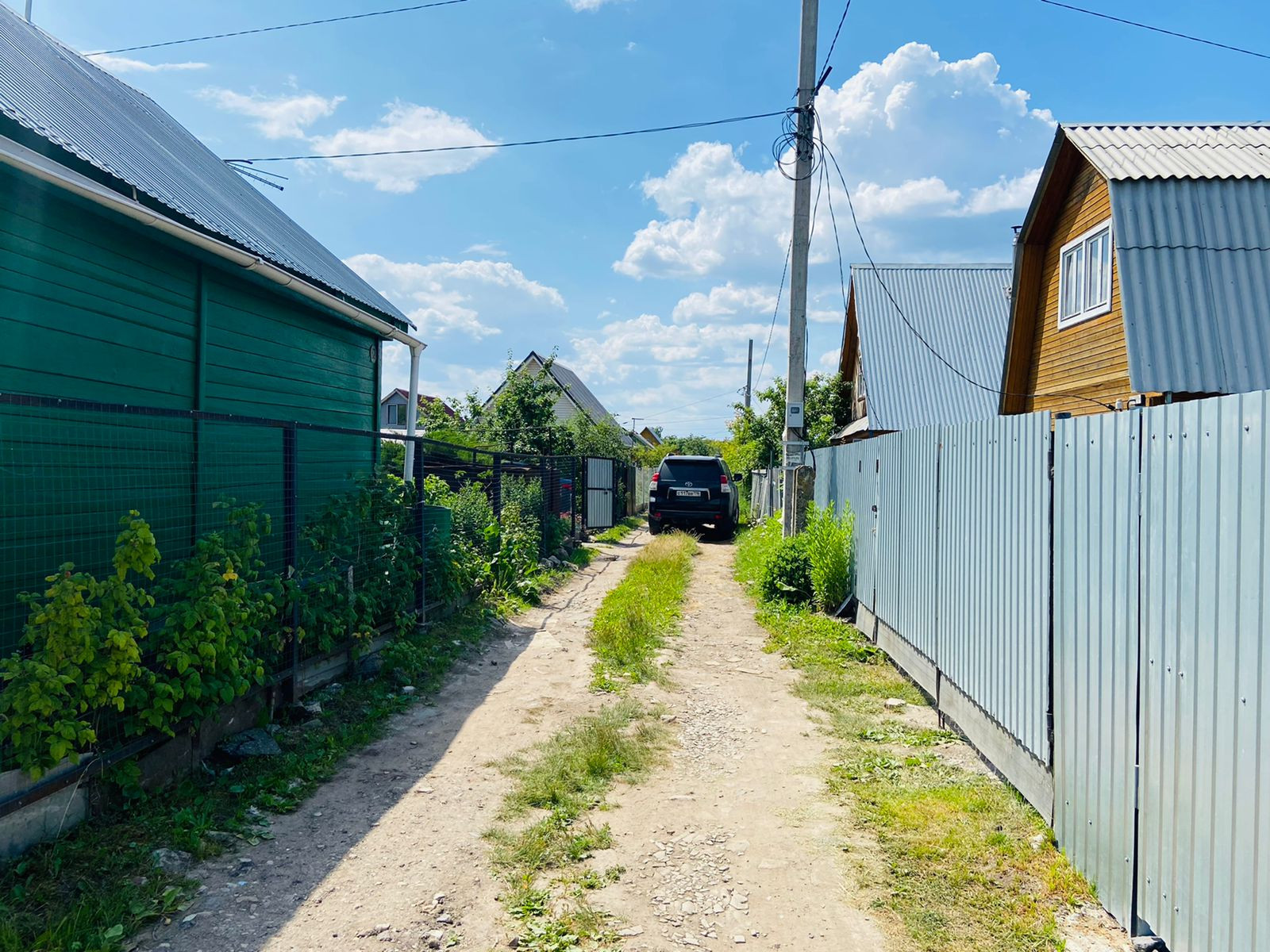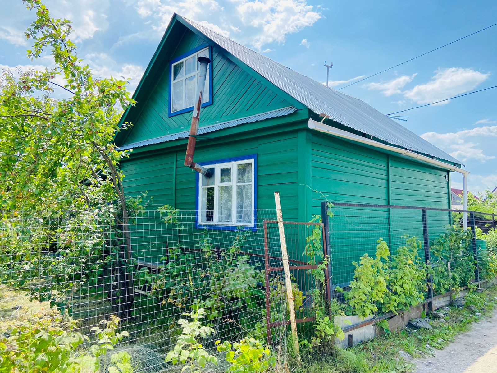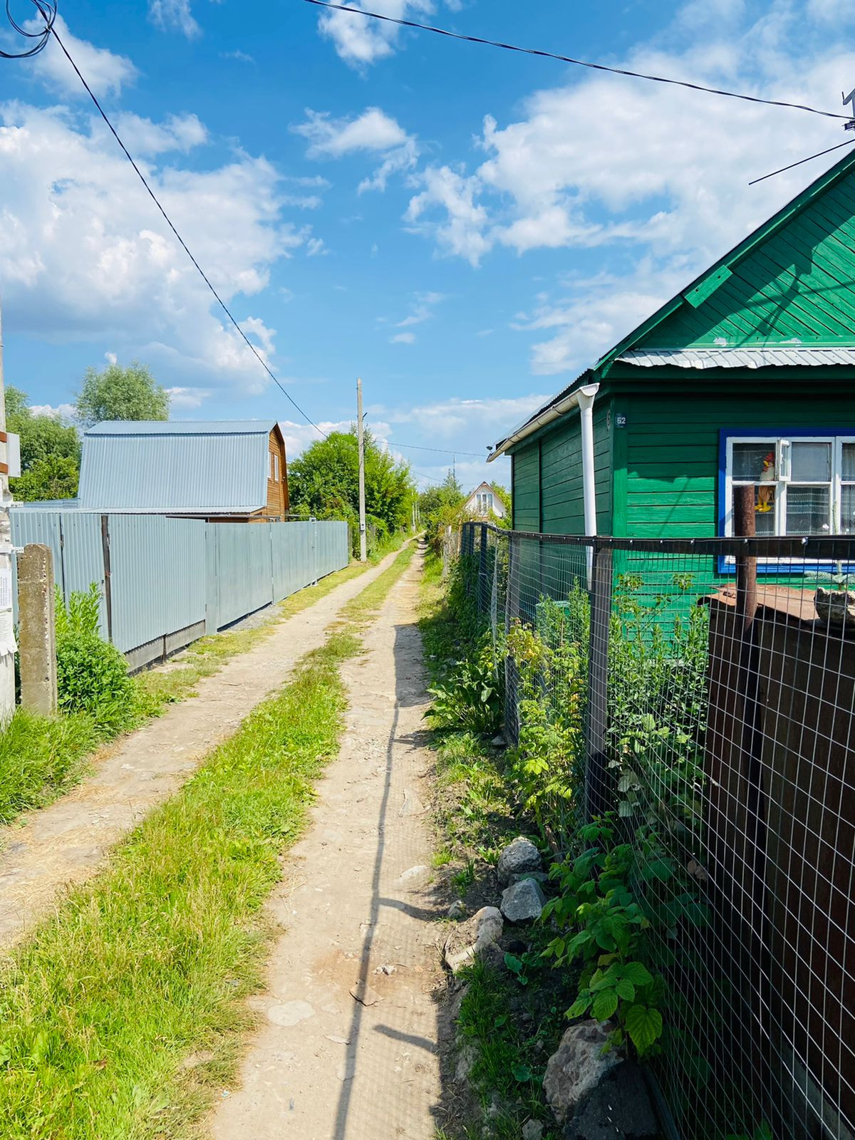 Участок с ограждением из металлической сетки на столбах, сараем и баней, летним туалетом. Два колодца с питьевой водой и для полива из 4 железобетонных колец. Территория оборудована своим парковочным местом на 2 машины.