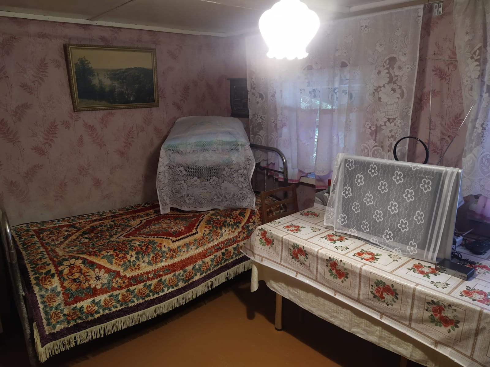 Дом двухэтажный , обычный, как раньше строили, кухня, гостиная и спальня.