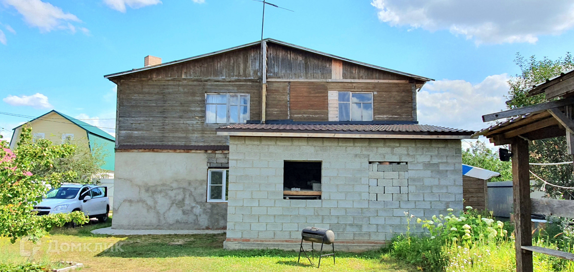 Дом 2-ух этажный из блока и дерева площадью 100 кв.м., на первом этаже кухня и большая гостиная с камином. На втором этаже спальня и детская на 3 спальных места с видом на двор. Пристройка к дому почти готова, осталось установить входную дверь и окно.