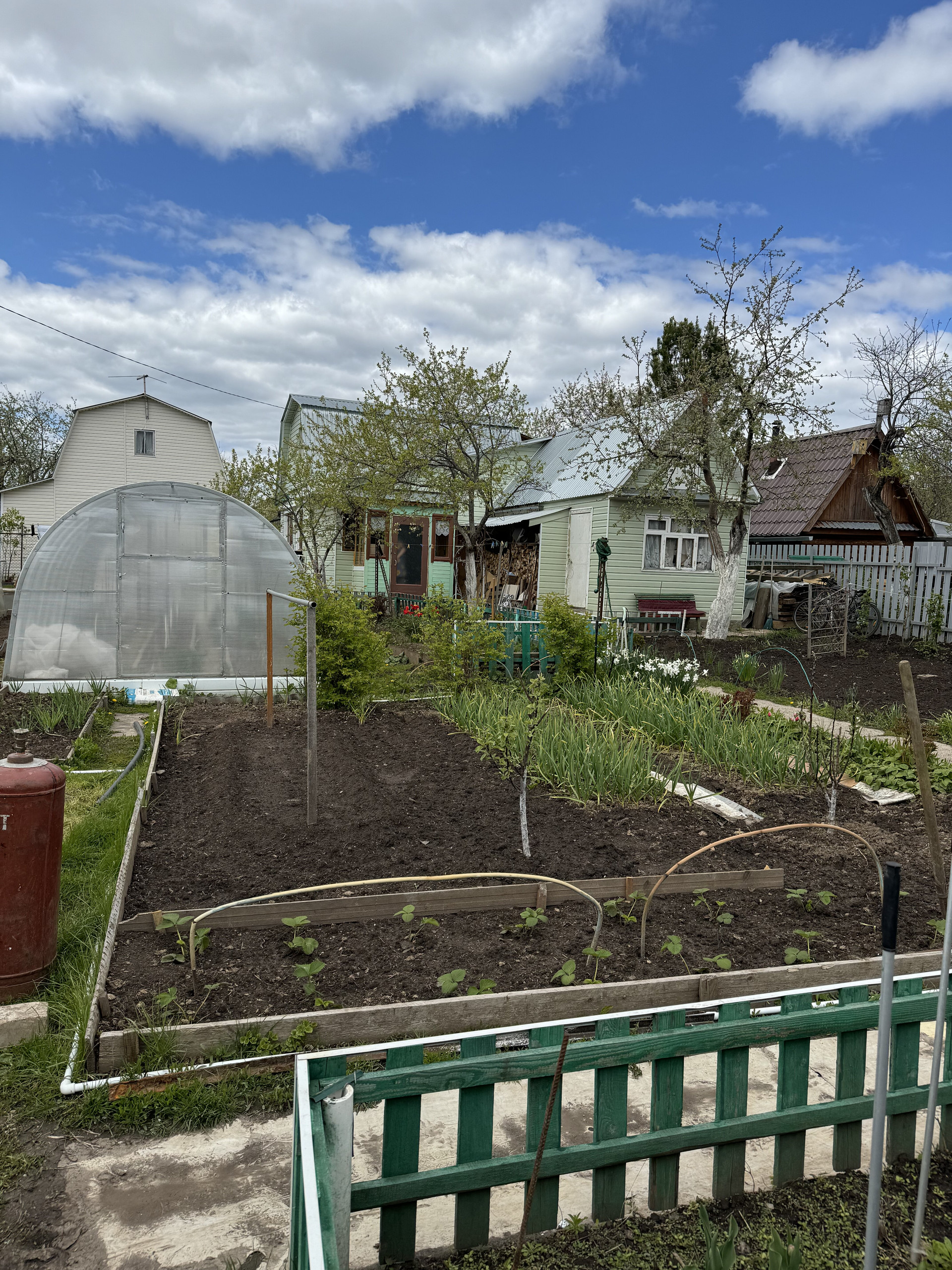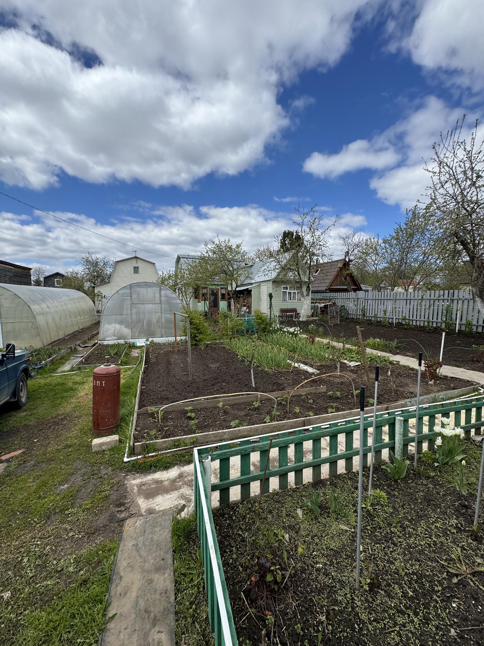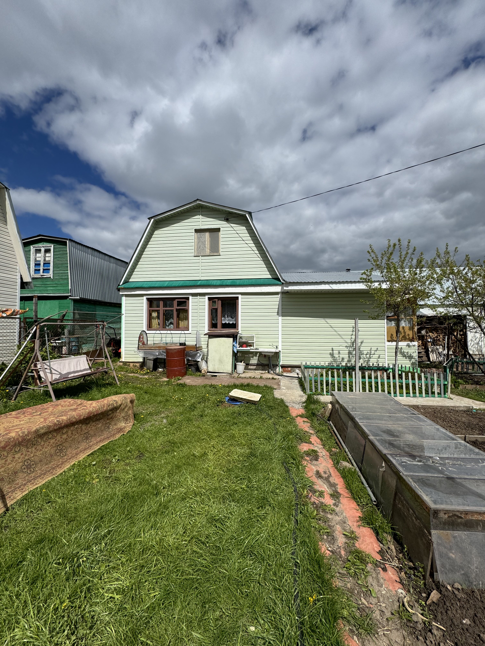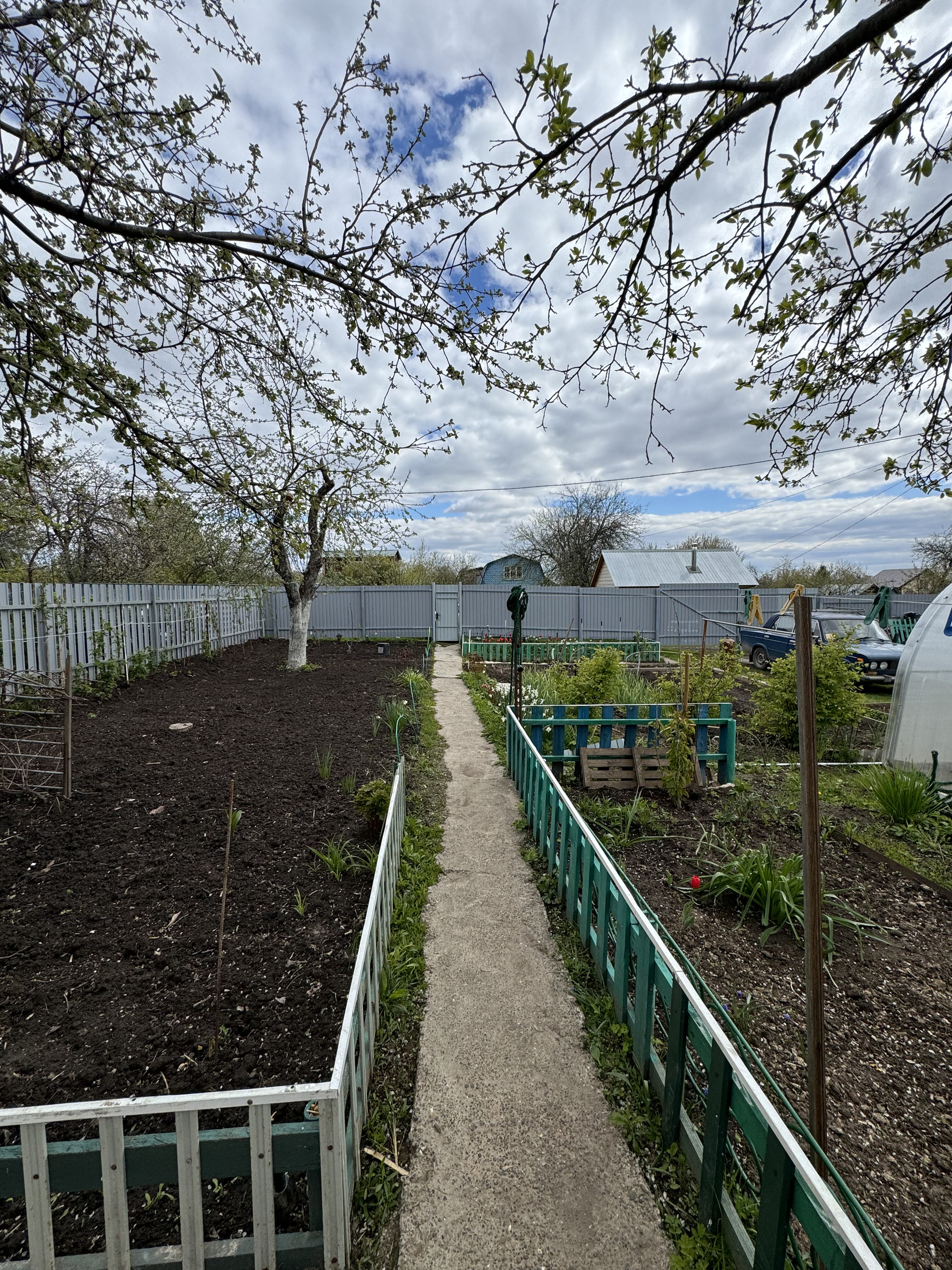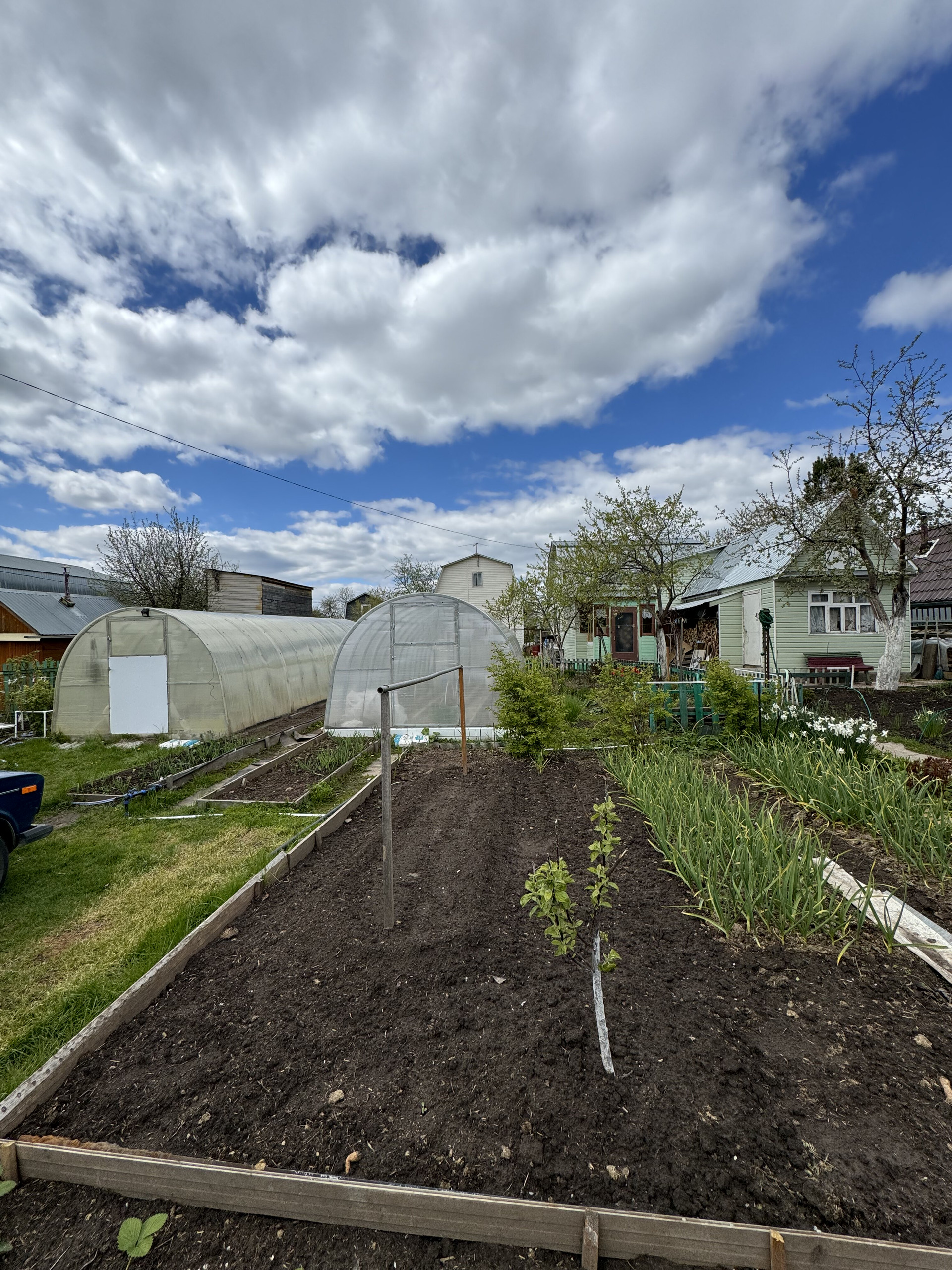 На участке имеется 2 парника , ухоженный сад с насаждениями .