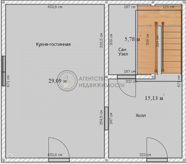 Первый этаж: Холл S= 6,8 кв.м., кухня- гостиная S= 29 кв.м., санузел S= 3.4
